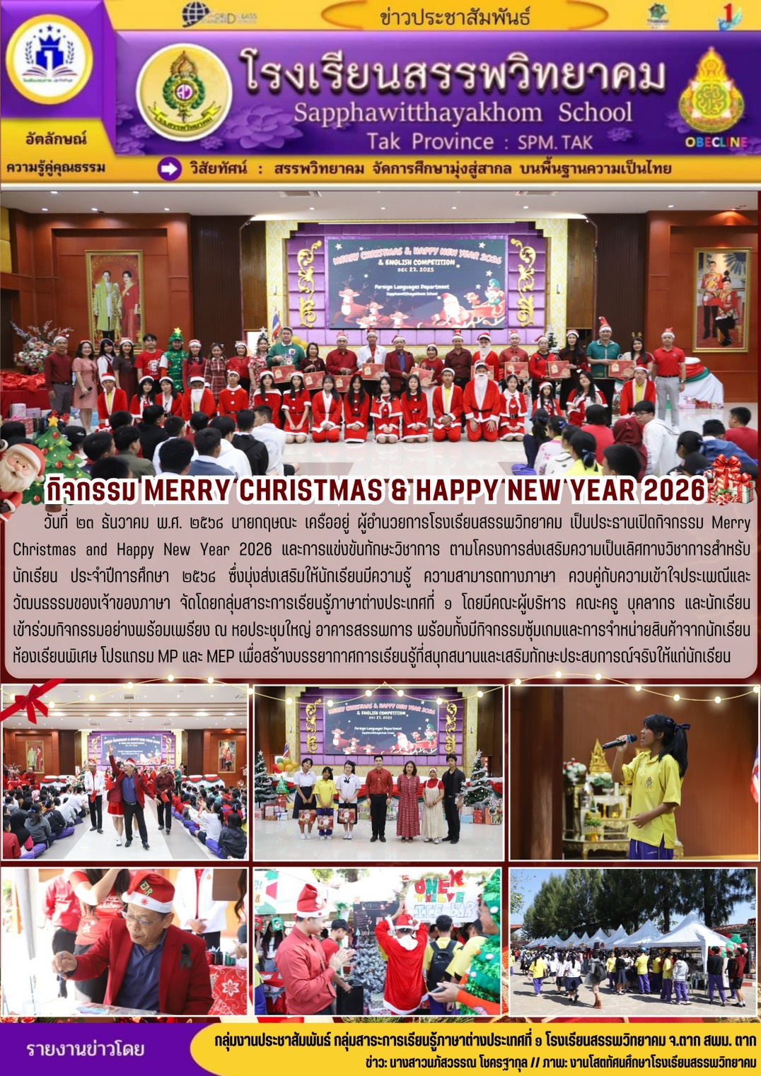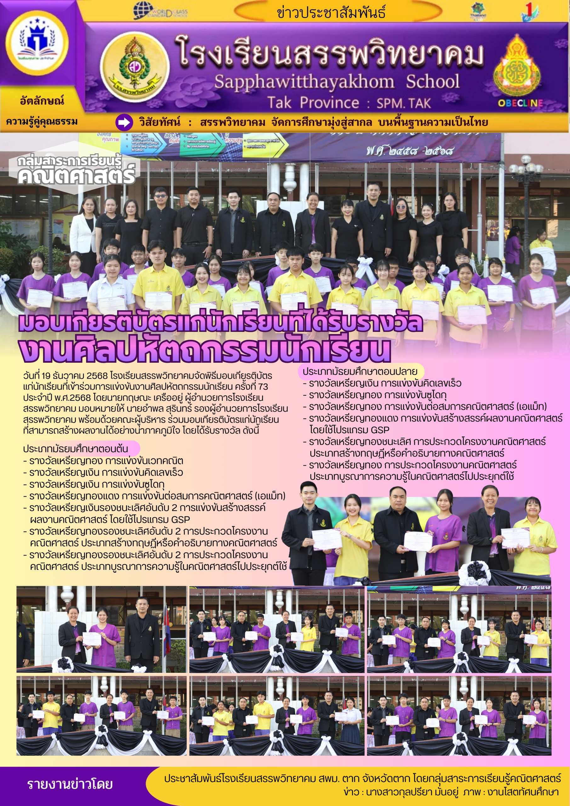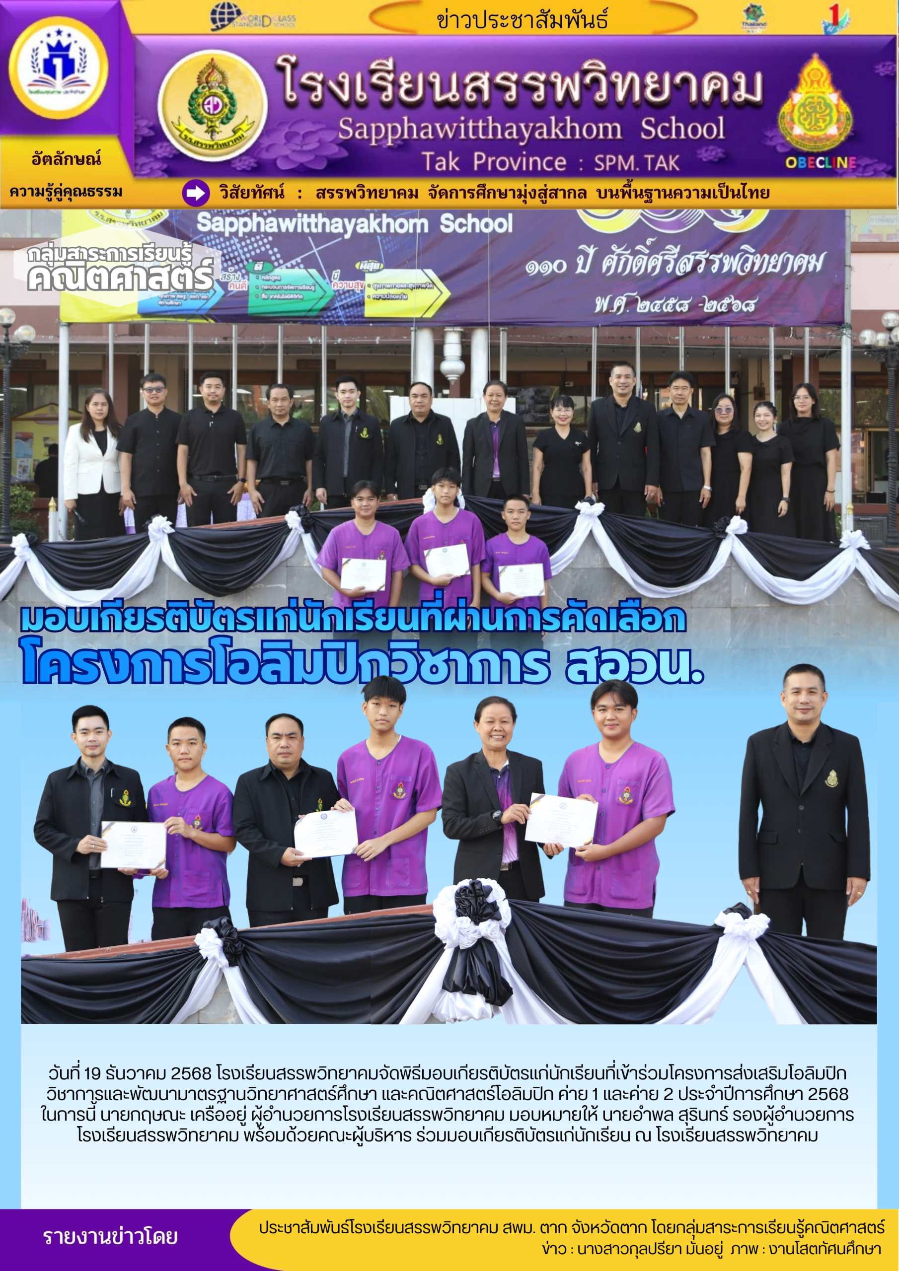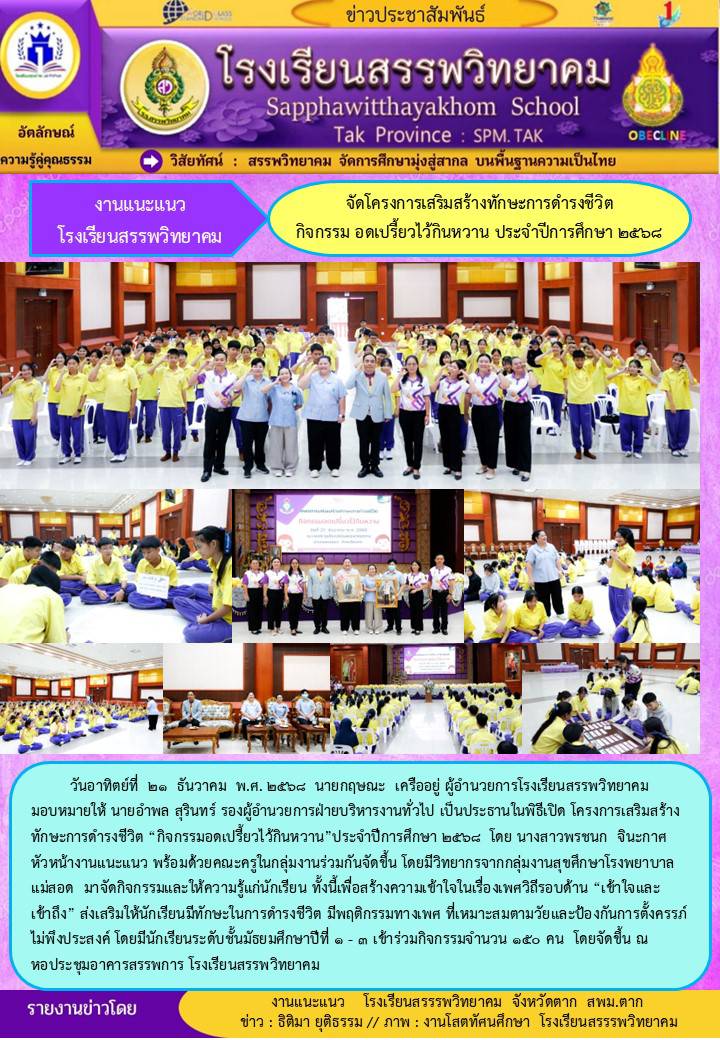 วันที่ ๒๗ ธันวาคม พ.ศ. ๒๕๖๘ โรงเรียนสรรพวิทยาคม ร่วมพิธีเปิดการแข่งขันกีฬา-กรีฑานักเรียนมัธยมศึกษา ฝั่งตะวันตก “ทวิธารเกมส์” ครั้งที่ ๑ จังหวัดตาก ประจำปี พ.ศ. ๒๕๖๘ โดยมีโรงเรียนที่เข้าร่ว…