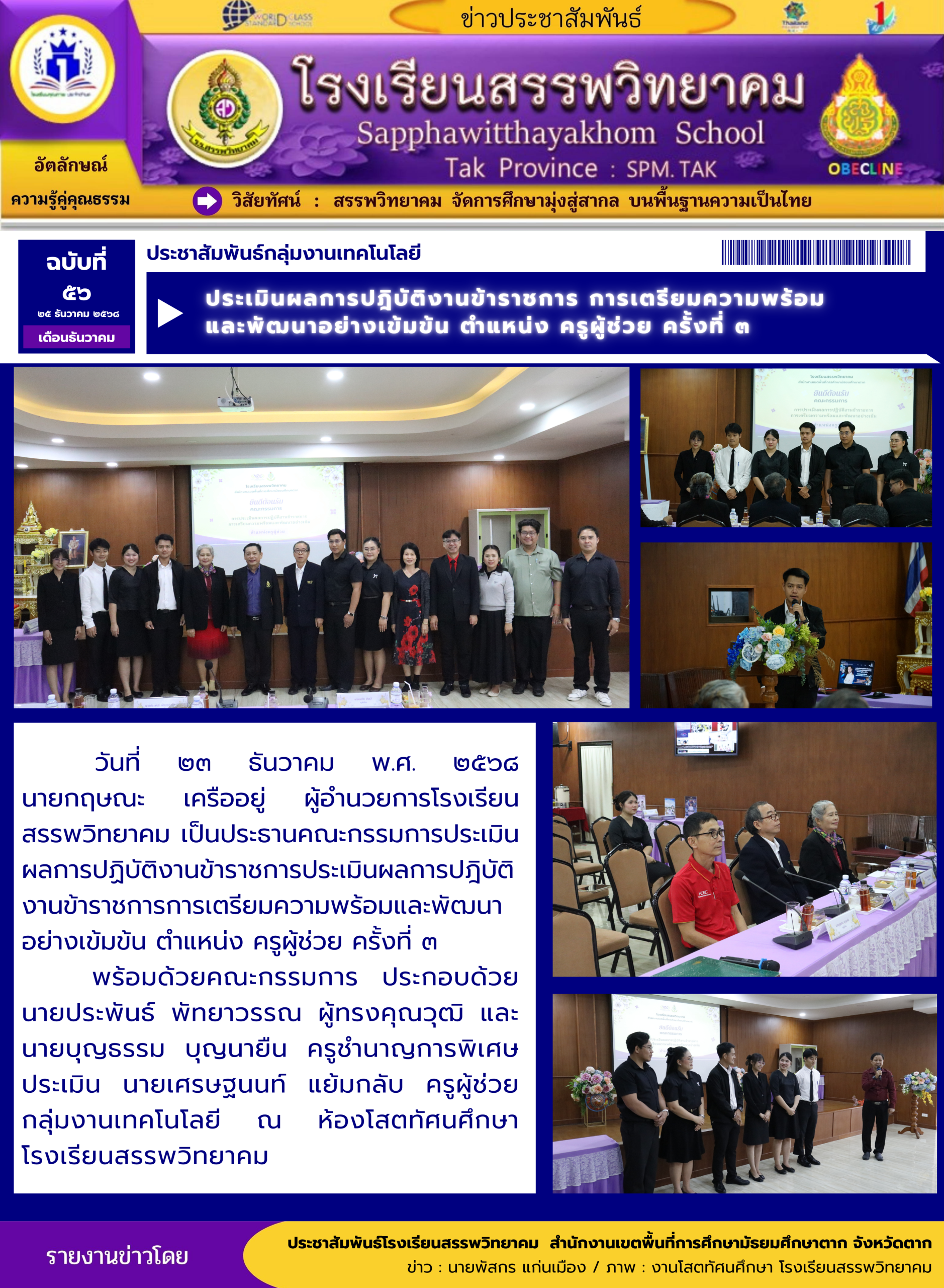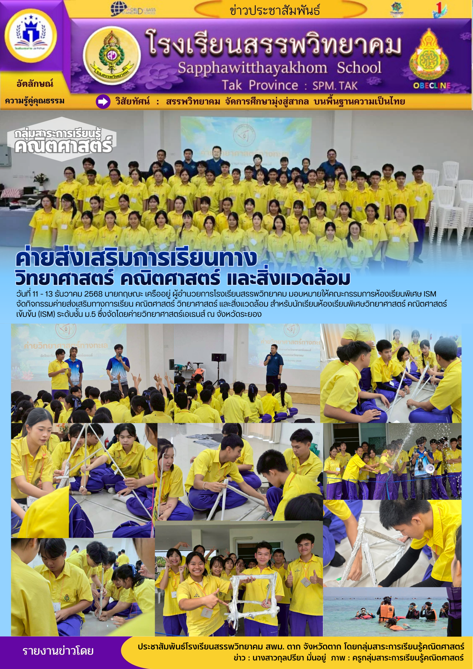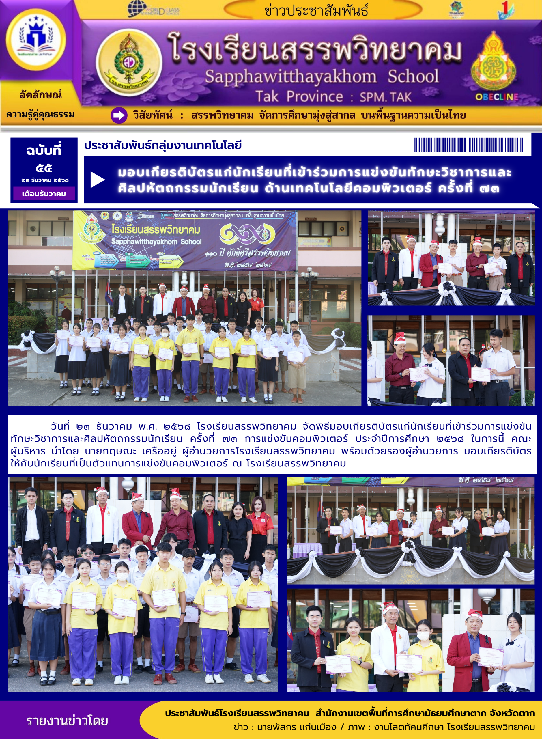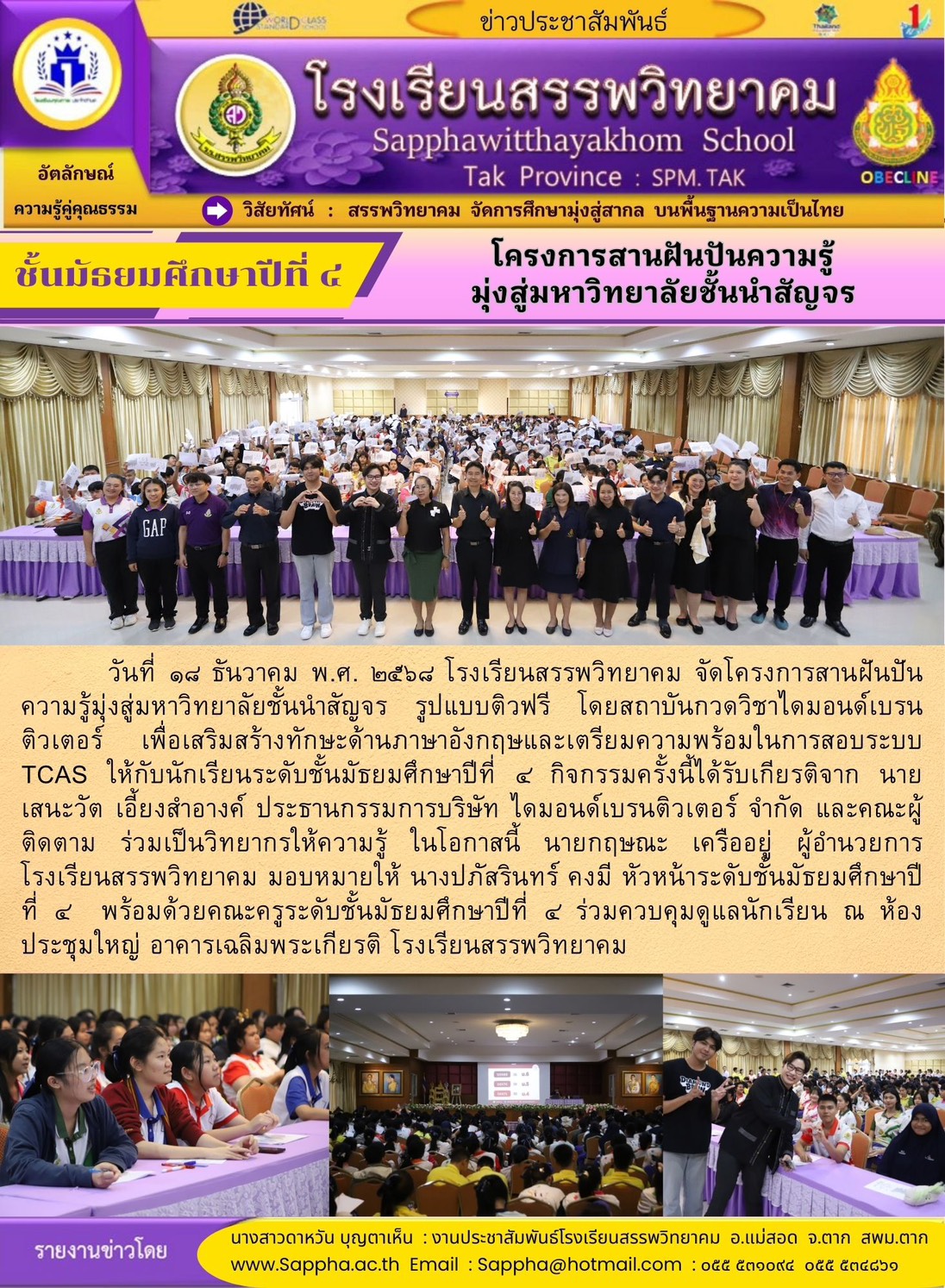 วันที่ ๒๗ ธันวาคม พ.ศ. ๒๕๖๘ โรงเรียนสรรพวิทยาคม ร่วมพิธีเปิดการแข่งขันกีฬา-กรีฑานักเรียนมัธยมศึกษา ฝั่งตะวันตก “ทวิธารเกมส์” ครั้งที่ ๑ จังหวัดตาก ประจำปี พ.ศ. ๒๕๖๘ โดยมีโรงเรียนที่เข้าร่ว…