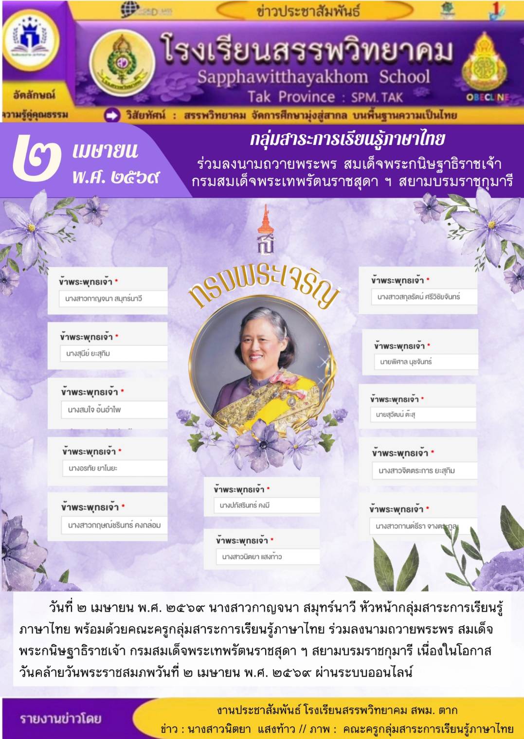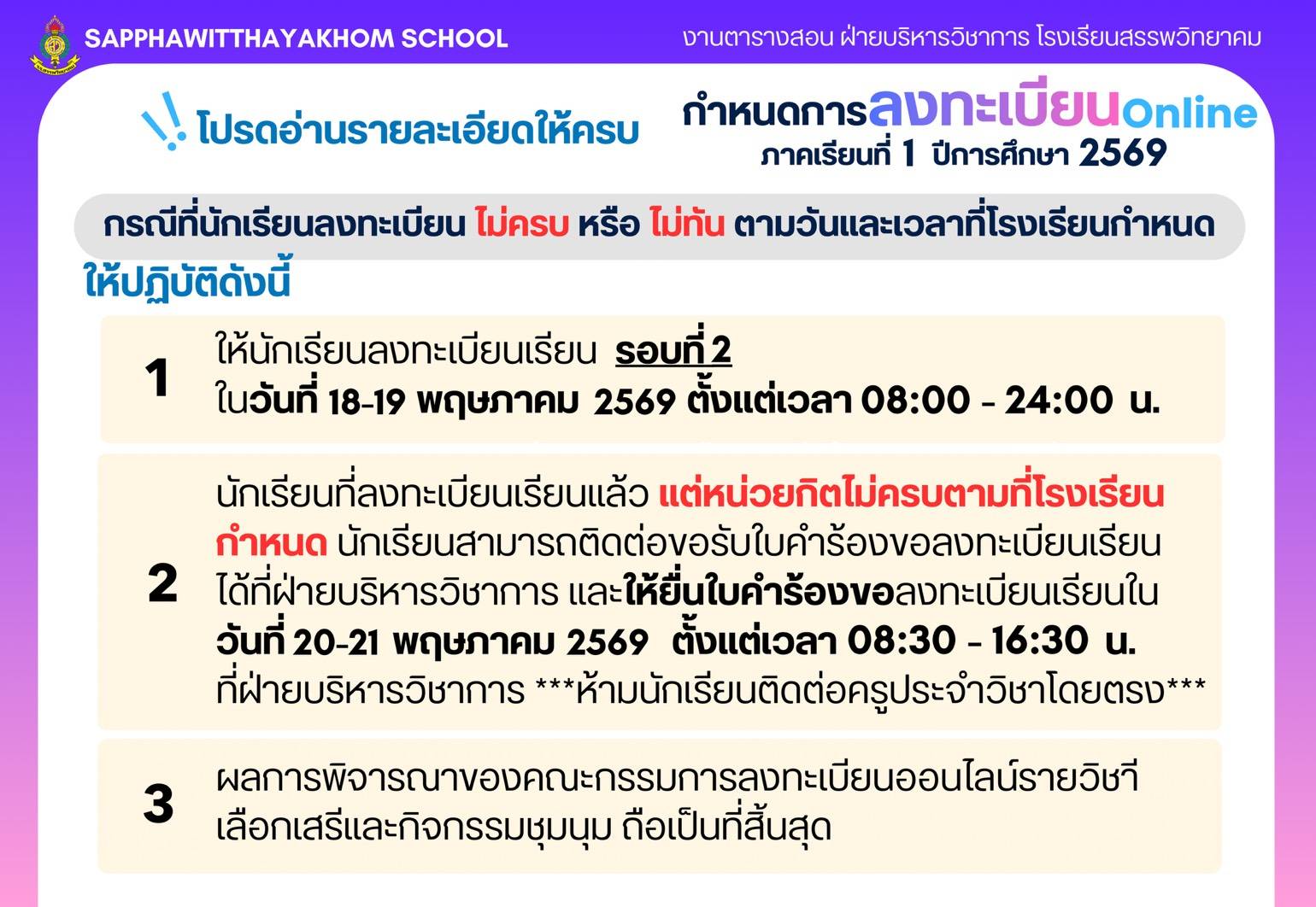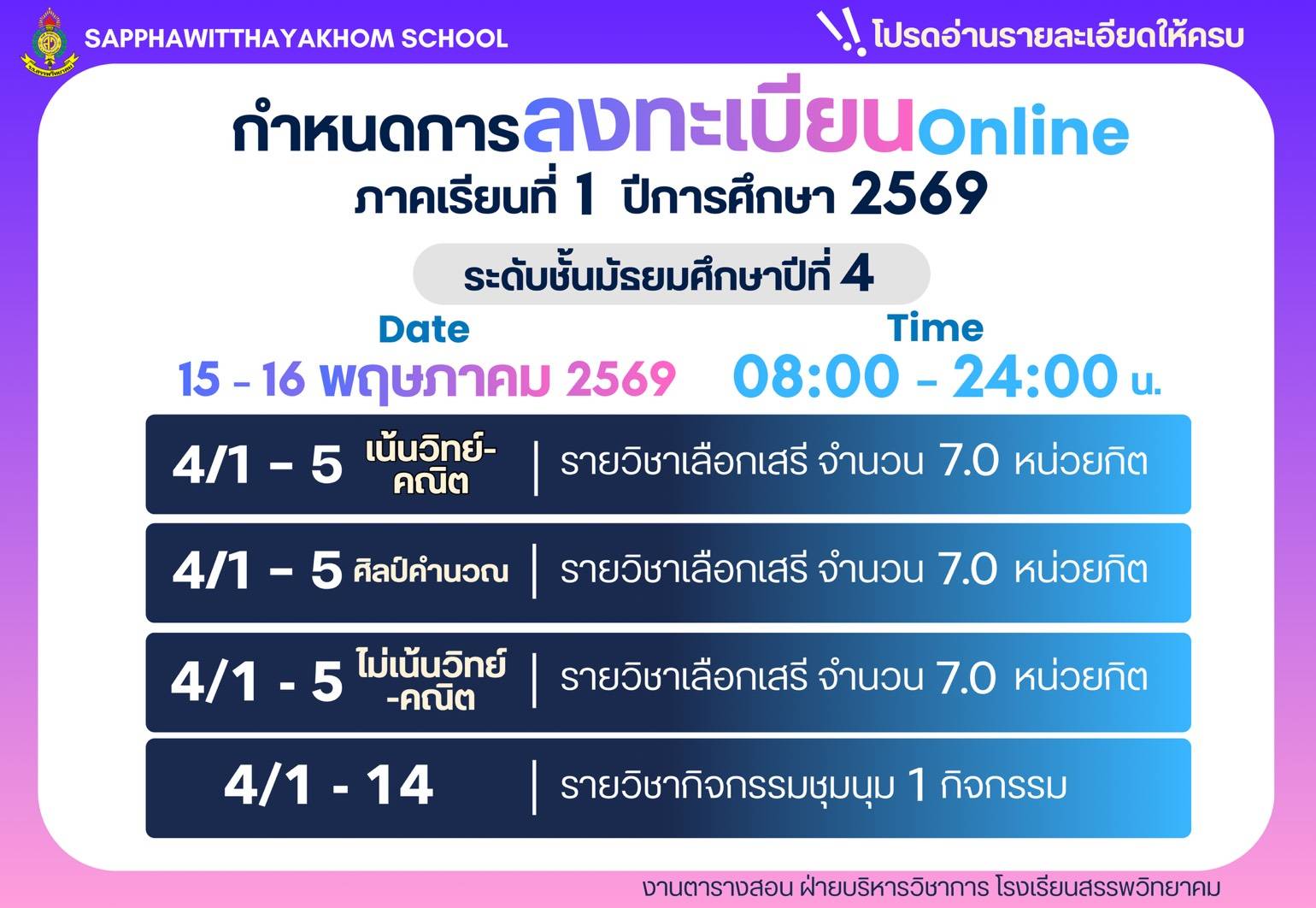 โรงเรียนสรรพวิทยาคม ประกาศ เรื่อง ผลการคัดเลือกนักเรียนระดับชั้นมัธยมศึกษาปีที่ ๔ ประเภทห้องเรียนปกติ ห้องเรียนภาษาเมียนมา (เพิ่มเติม) ประจำปีการศึกษา ๒๕๖๙