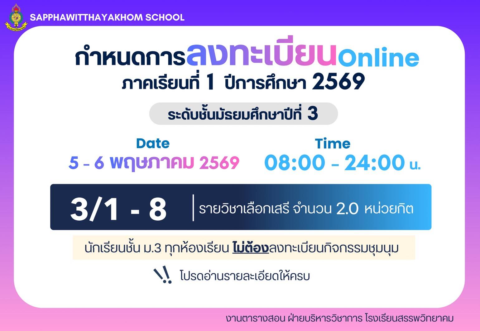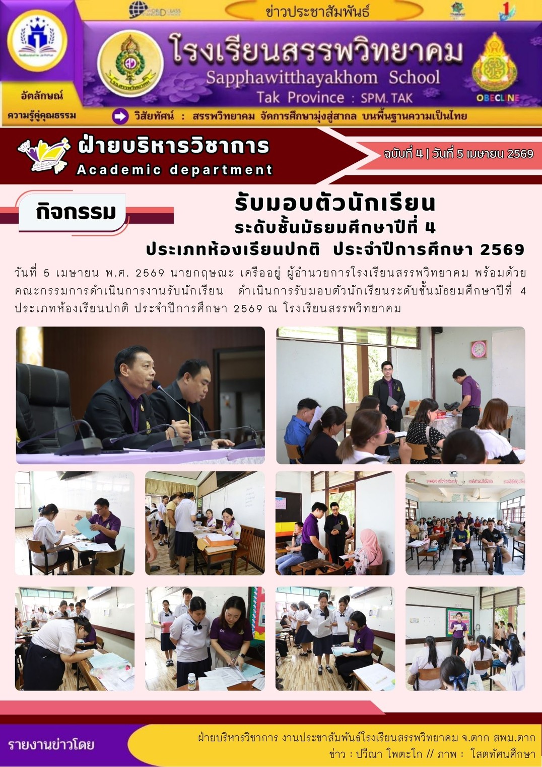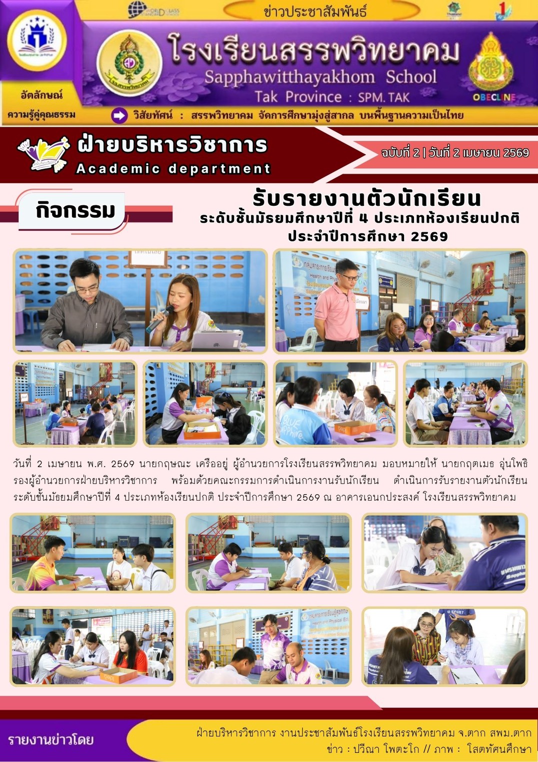 ตามที่โรงเรียนสรรพวิทยาคม ได้ประกาศรับสมัครนักเรียนเพื่อเข้าเรียนต่อในระดับชั้นมัธยมศึกษาปีที่ ๔ ประเภทห้องเรียนปกติ ห้องเรียนภาษาเมียนมา (เพิ่มเติม) ประจำปีการศึกษา ๒๕๖๙ ลงวันที่ ๕ เมษายน พ.ศ.๒๕๖๙ นั…