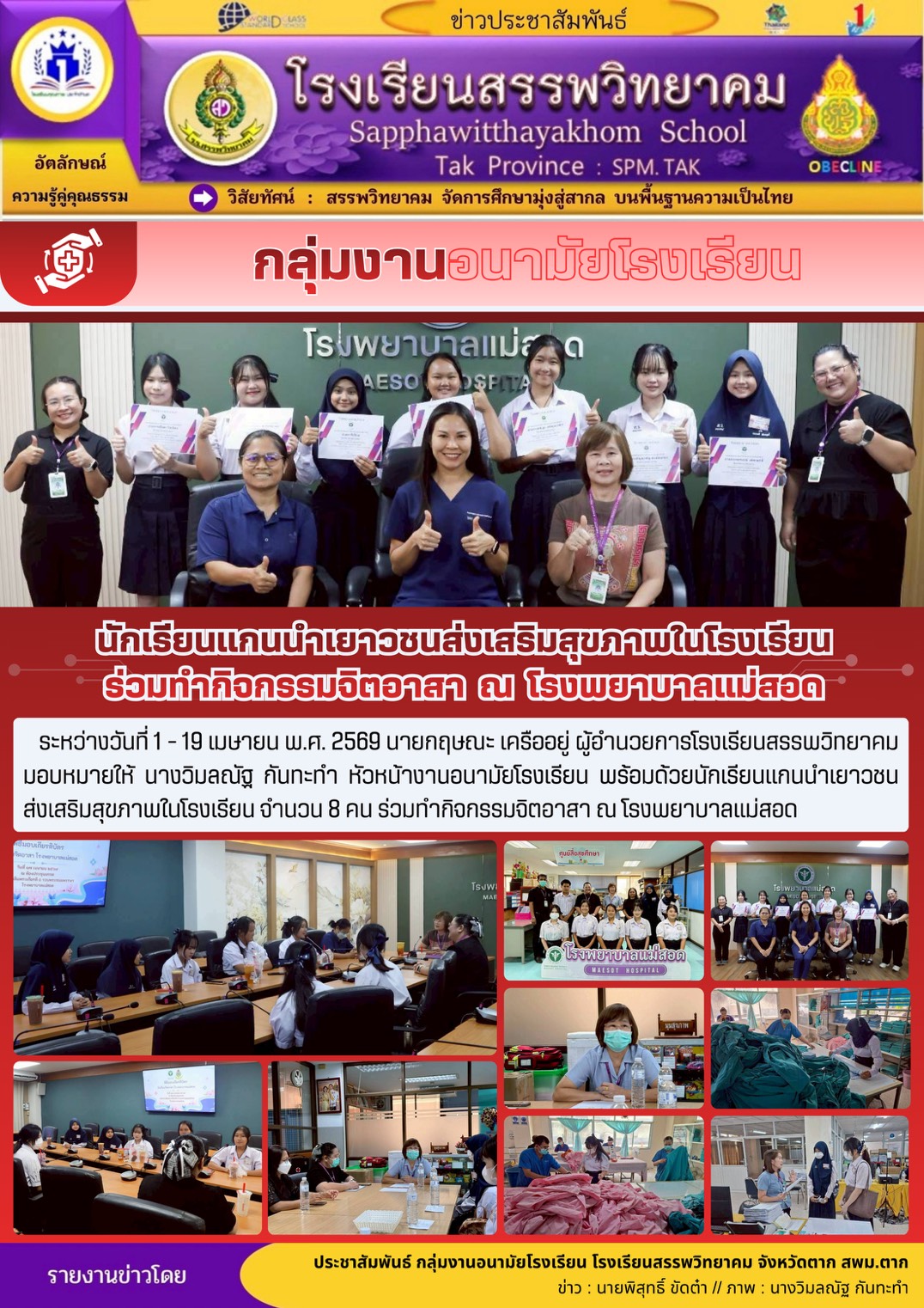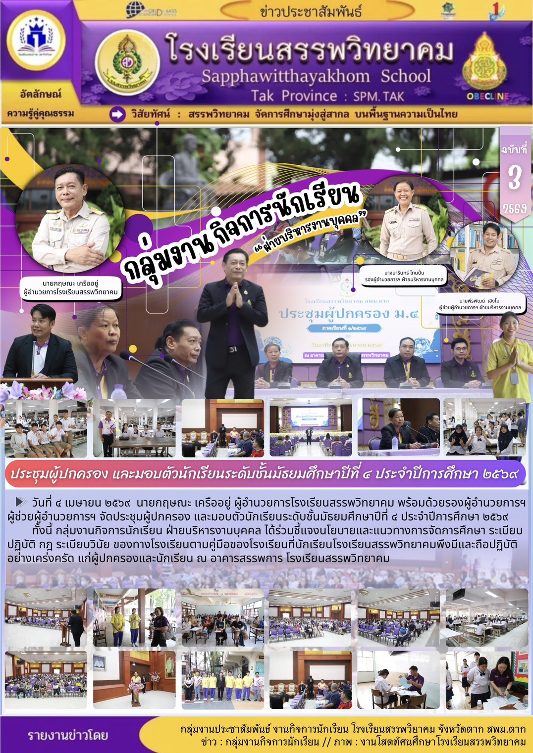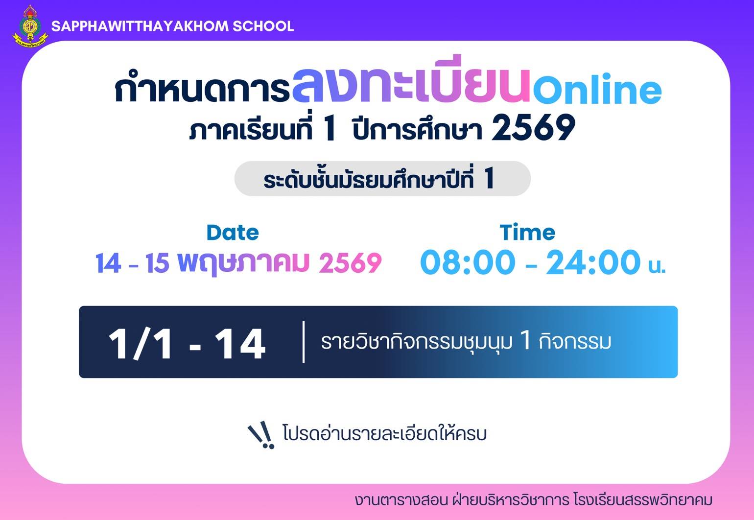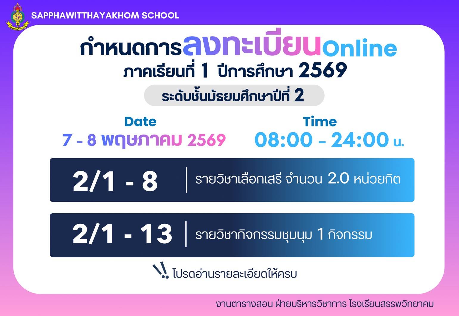 ตามที่โรงเรียนสรรพวิทยาคม ได้ประกาศรับสมัครนักเรียนเพื่อเข้าเรียนต่อในระดับชั้นมัธยมศึกษาปีที่ ๔ ประเภทห้องเรียนปกติ ห้องเรียนภาษาเมียนมา (เพิ่มเติม) ประจำปีการศึกษา ๒๕๖๙ ลงวันที่ ๕ เมษายน พ.ศ.๒๕๖๙ นั…