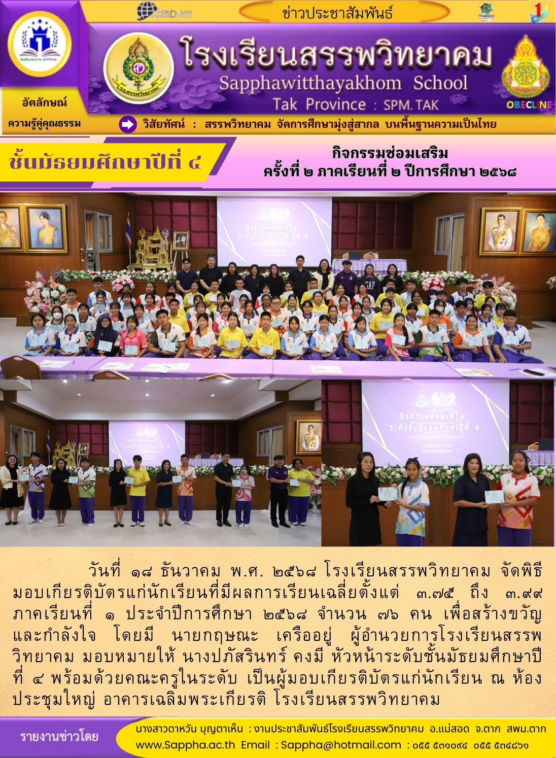 ประกาศโรงเรียนสรรพวิทยาคม เรื่อง ประกาศรายชื่อนักเรียนระดับชั้นมัธยมศึกษาปีที่ ๓ (เดิม) ที่มีสิทธิ์สมัครเพื่อเข้าศึกษาต่อ ระดับชั้นมัธยมศึกษาปีที่ ๔ (โควตาภายใน) ประเภทมีผลการเรียนดี ประเภทเป็นคนดี มี…