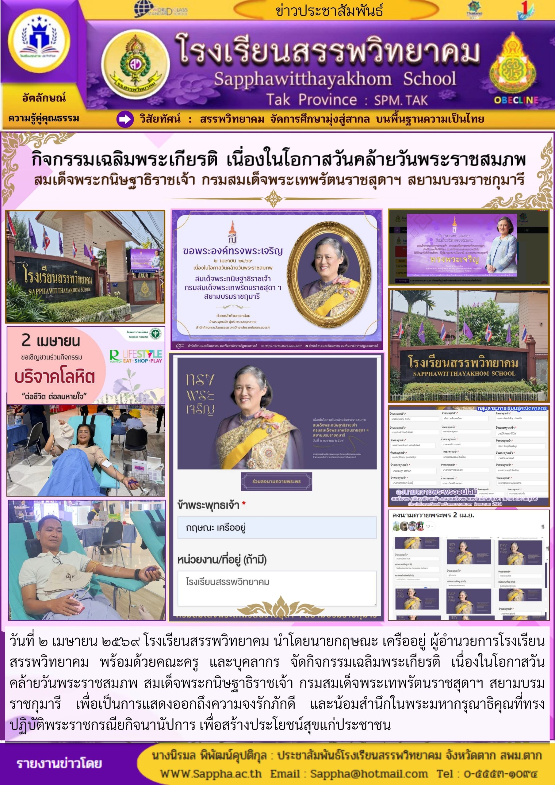 วันที่ ๑๘ เมษายน ๒๕๖๙ โรงเรียนสรรพวิทยาคม ได้จัดพิธีรดน้ำดำหัวผู้บริหารอาวุโส โรงเรียนสรรพวิยาคม เนื่องในวาระดิถีขึ้นปีใหม่ และวันสงกรานต์ตามประเพณีรดน้ำดำหัวผู้อาวุโส เพื่อเป็นการแสดงความเคารพ และอำน…