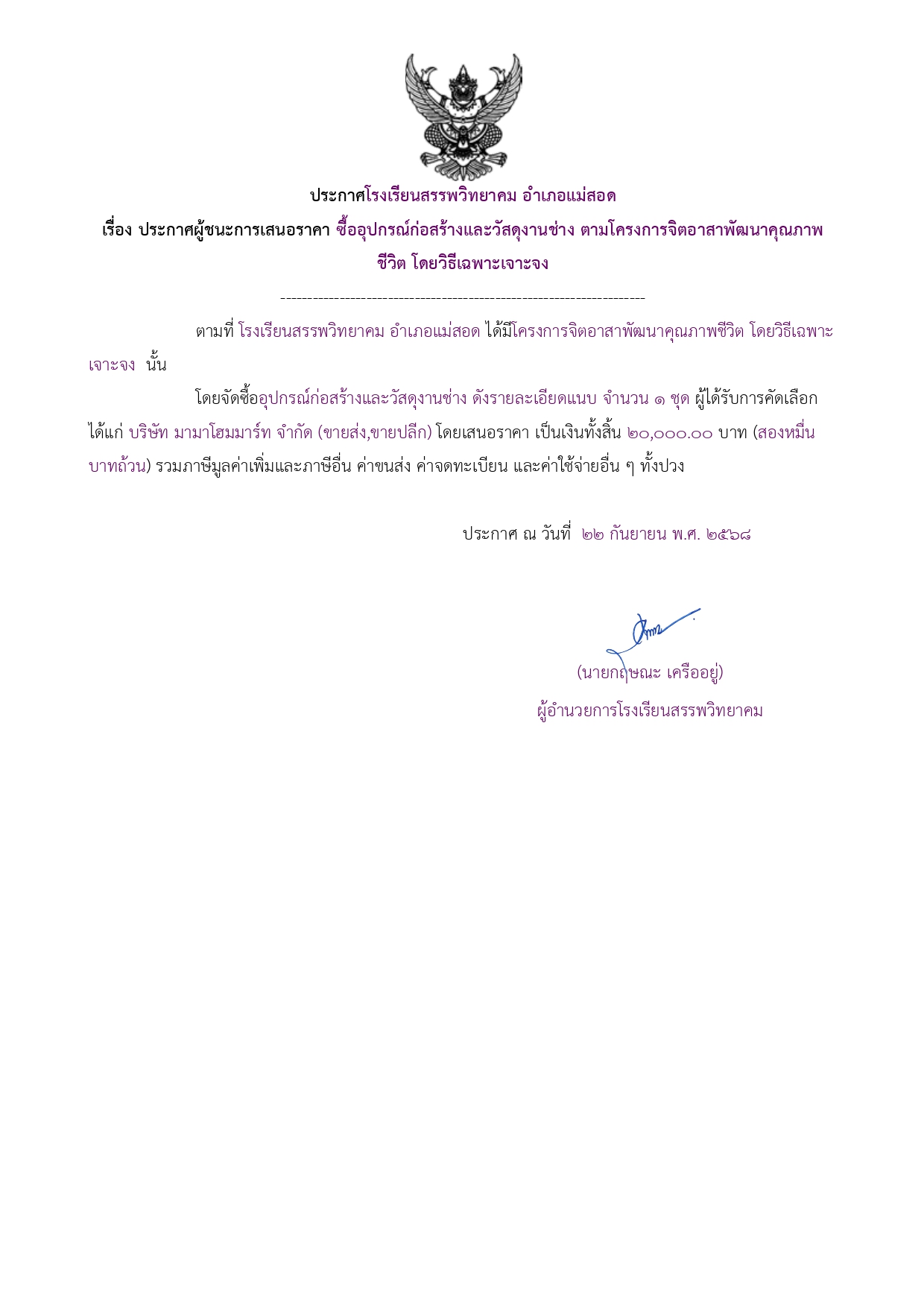 ประกาศผู้ชนะการเสนอราคา ซื้ออุปกรณ์ก่อสร้างและวัสดุงานช่าง ตามโครงการจิตอาสาพัฒนาคุณภาพชีวิต โดยวิธีเฉพาะเจาะจง