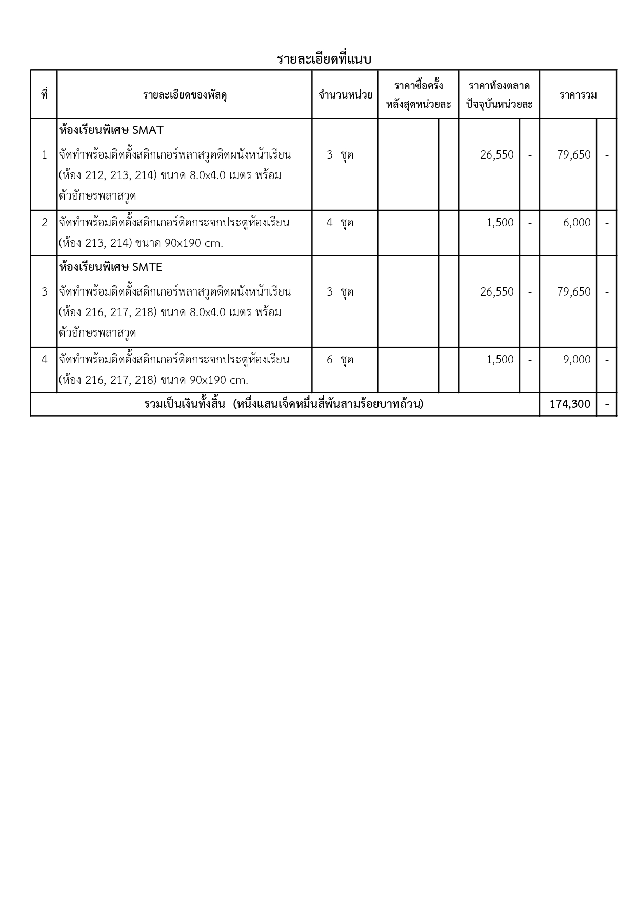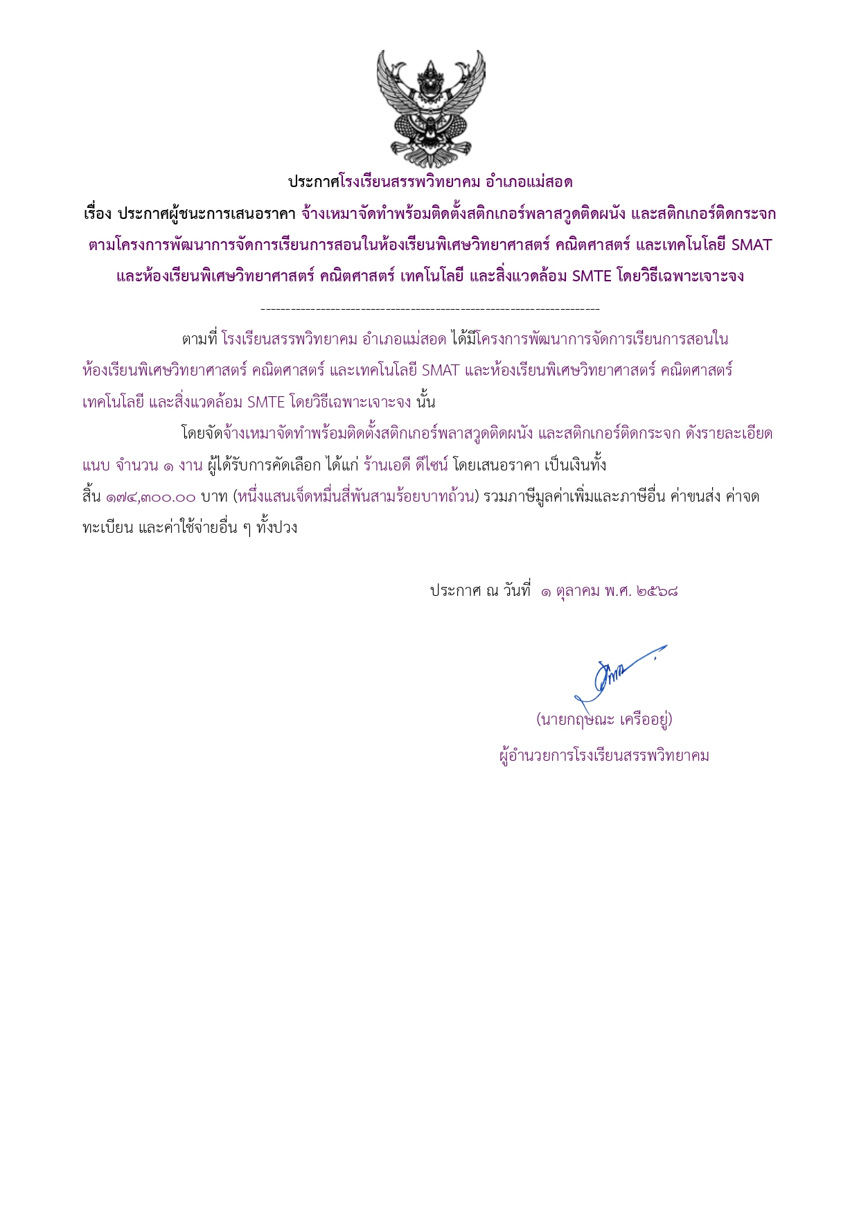 ประกาศผู้ชนะการเสนอราคา จ้างเหมาจัดทำพร้อมติดตั้งสติกเกอร์พลาสวูดติดผนัง และสติกเกอร์ติดกระจก ตามโครงการพัฒนาการจัดการเรียนการสอนในห้องเรียนพิเศษวิทยาศาสตร์ คณิตศาสตร์ และเทคโนโลยี SMAT และห้องเรียนพิเศษวิทยาศาสตร์ คณิตศาสตร์ เทคโนโลยี และสิ่งแวดล้อม SMTE โดยวิธีเฉพาะเจาะจง