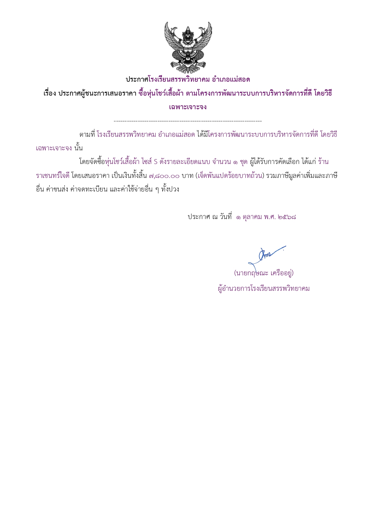 ประกาศผู้ชนะการเสนอราคา ซื้อหุ่นโชว์เสื้อผ้า ตามโครงการพัฒนาระบบการบริหารจัดการที่ดี โดยวิธีเฉพาะเจาะจง