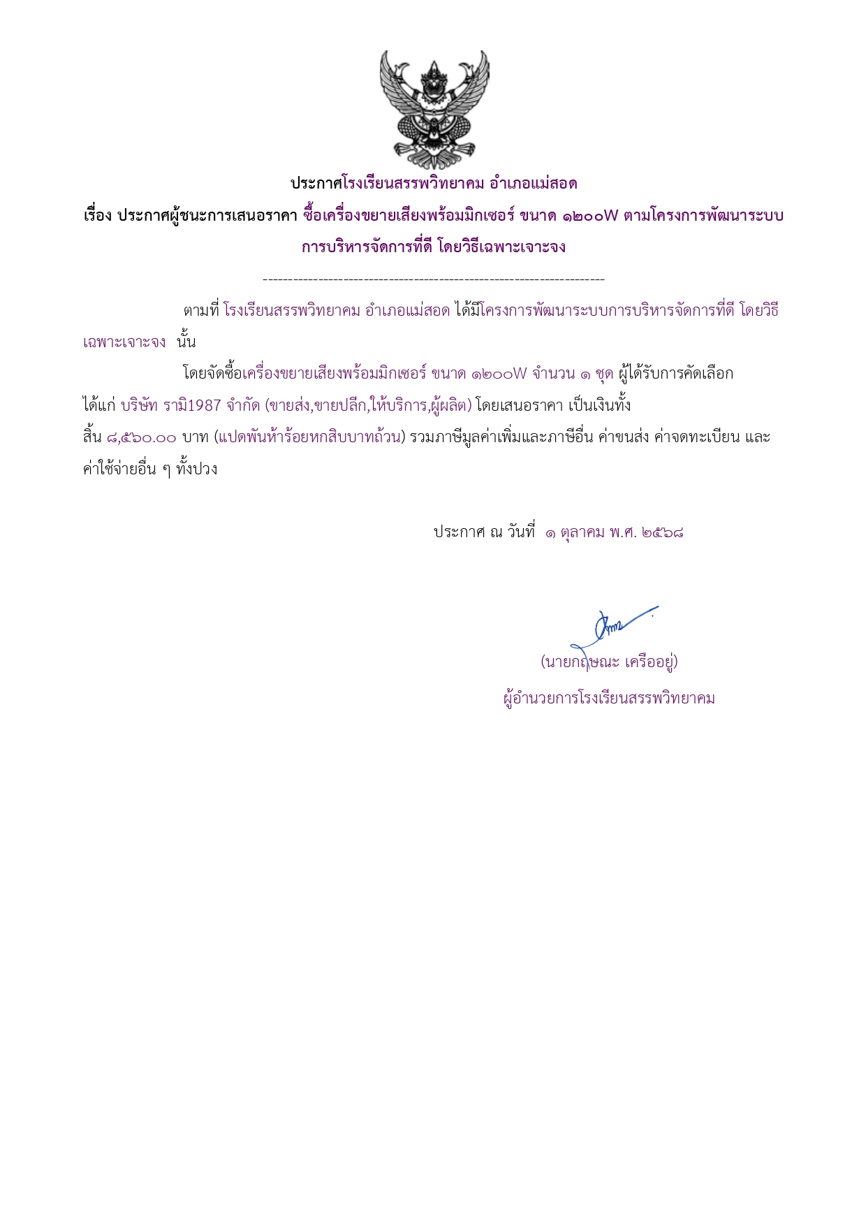ประกาศผู้ชนะการเสนอราคา ซื้อเครื่องขยายเสียงพร้อมมิกเซอร์ ขนาด ๑๒๐๐W ตามโครงการพัฒนาระบบการบริหารจัดการที่ดี โดยวิธีเฉพาะเจาะจง