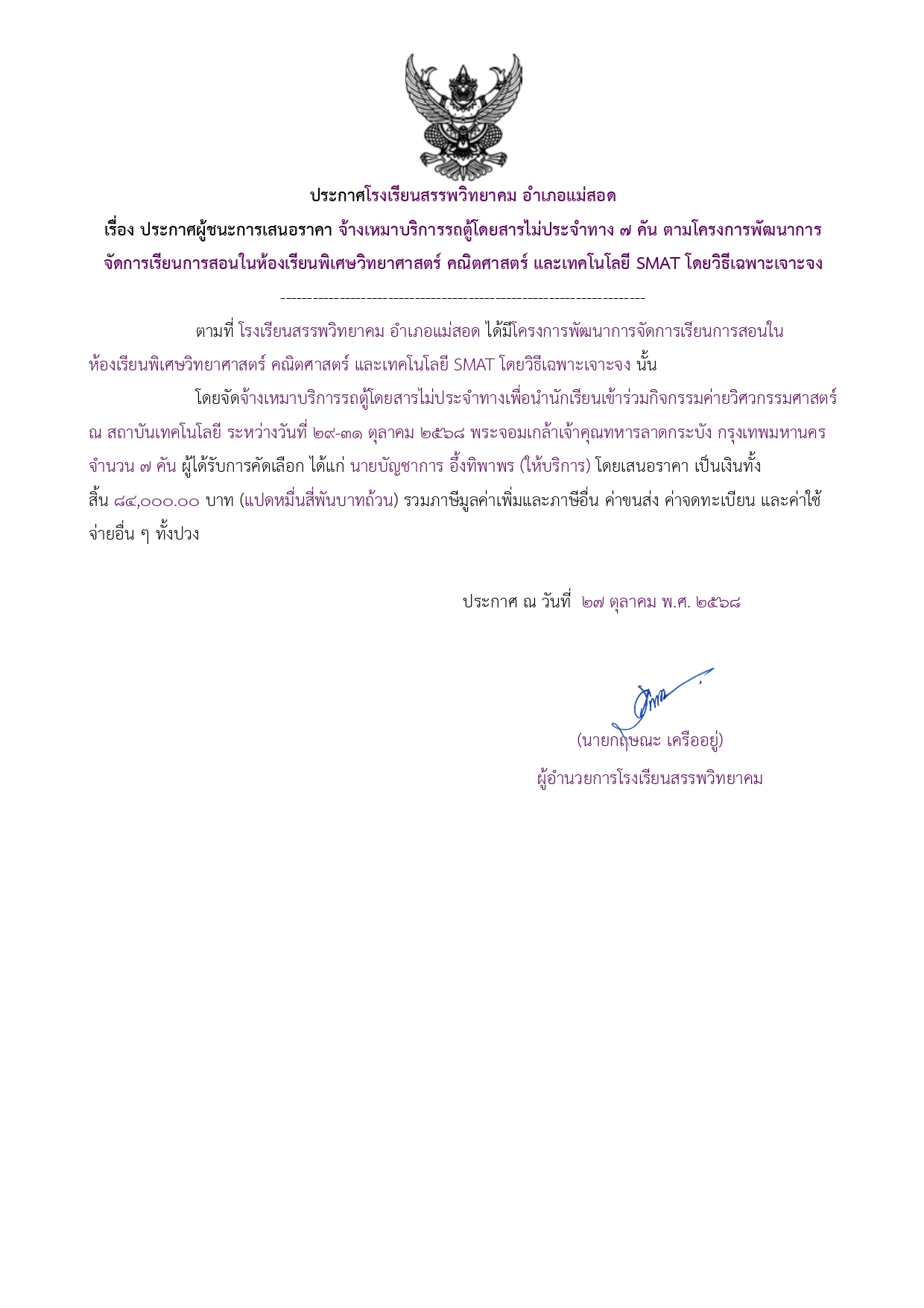 ประกาศผู้ชนะการเสนอราคา จ้างเหมาบริการรถตู้โดยสารไม่ประจำทาง ๗ คัน ตามโครงการพัฒนาการจัดการเรียนการสอนในห้องเรียนพิเศษวิทยาศาสตร์ คณิตศาสตร์ และเทคโนโลยี SMAT โดยวิธีเฉพาะเจาะจง