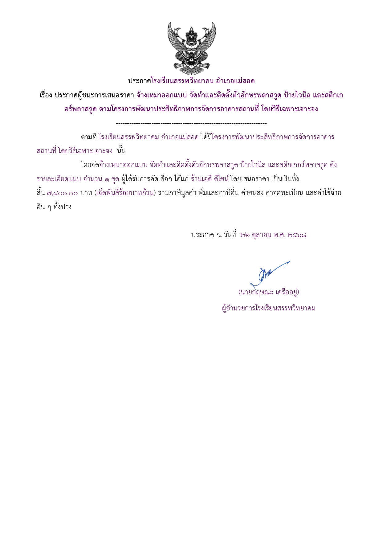 ประกาศผู้ชนะการเสนอราคา จ้างเหมาออกแบบ จัดทำและติดตั้งตัวอักษรพลาสวูด ป้ายไวนิล และสติกเกอร์พลาสวูด ตามโครงการพัฒนาประสิทธิภาพการจัดการอาคารสถานที่ โดยวิธีเฉพาะเจาะจง