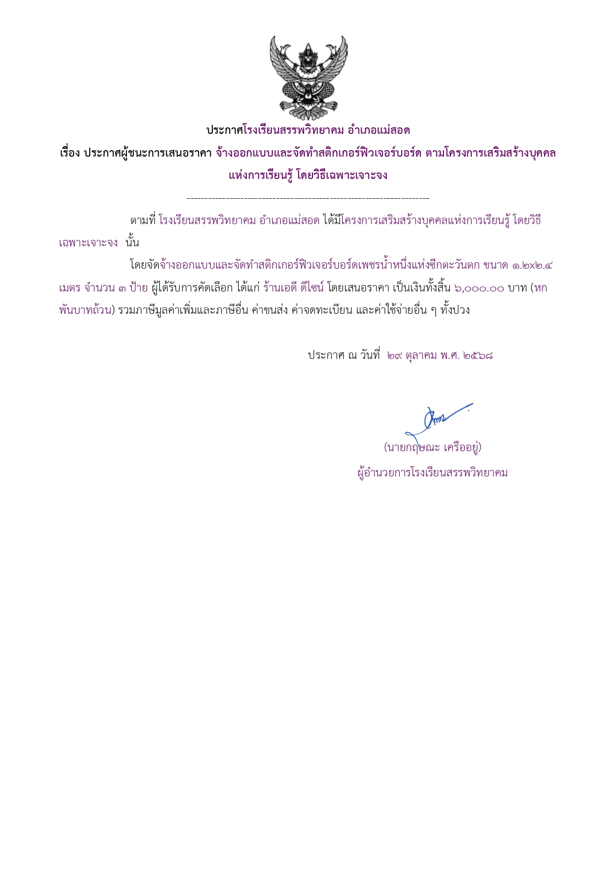 ประกาศผู้ชนะการเสนอราคา จ้างออกแบบและจัดทำสติกเกอร์ฟิวเจอร์บอร์ด
