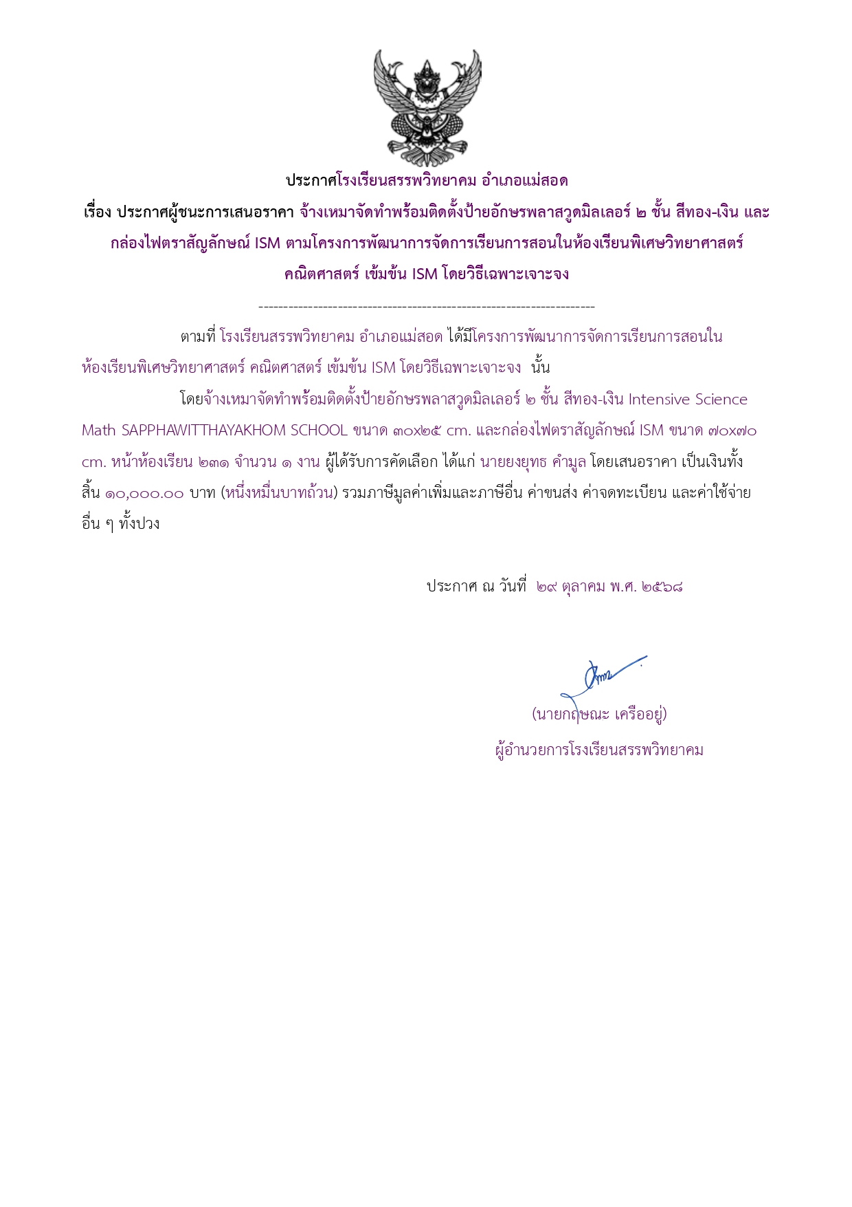 ประกาศผู้ชนะการเสนอราคา จ้างเหมาจัดทำพร้้อมติดตั้งป้ายอักษรพลาสวูดมิลเลอร์ ๒ ชั้น สีทอง-เงิน และกล่องไฟตราสัญลักษณ์ ISM ตามโครงการพัฒนาการจัดการเรียนการสอนในห้องเรียนพิเศษวิทยาศาสตร์ คณิตศาสตร์ เข้มข้น ISM โดยวิธีเฉพาะเจาะจง