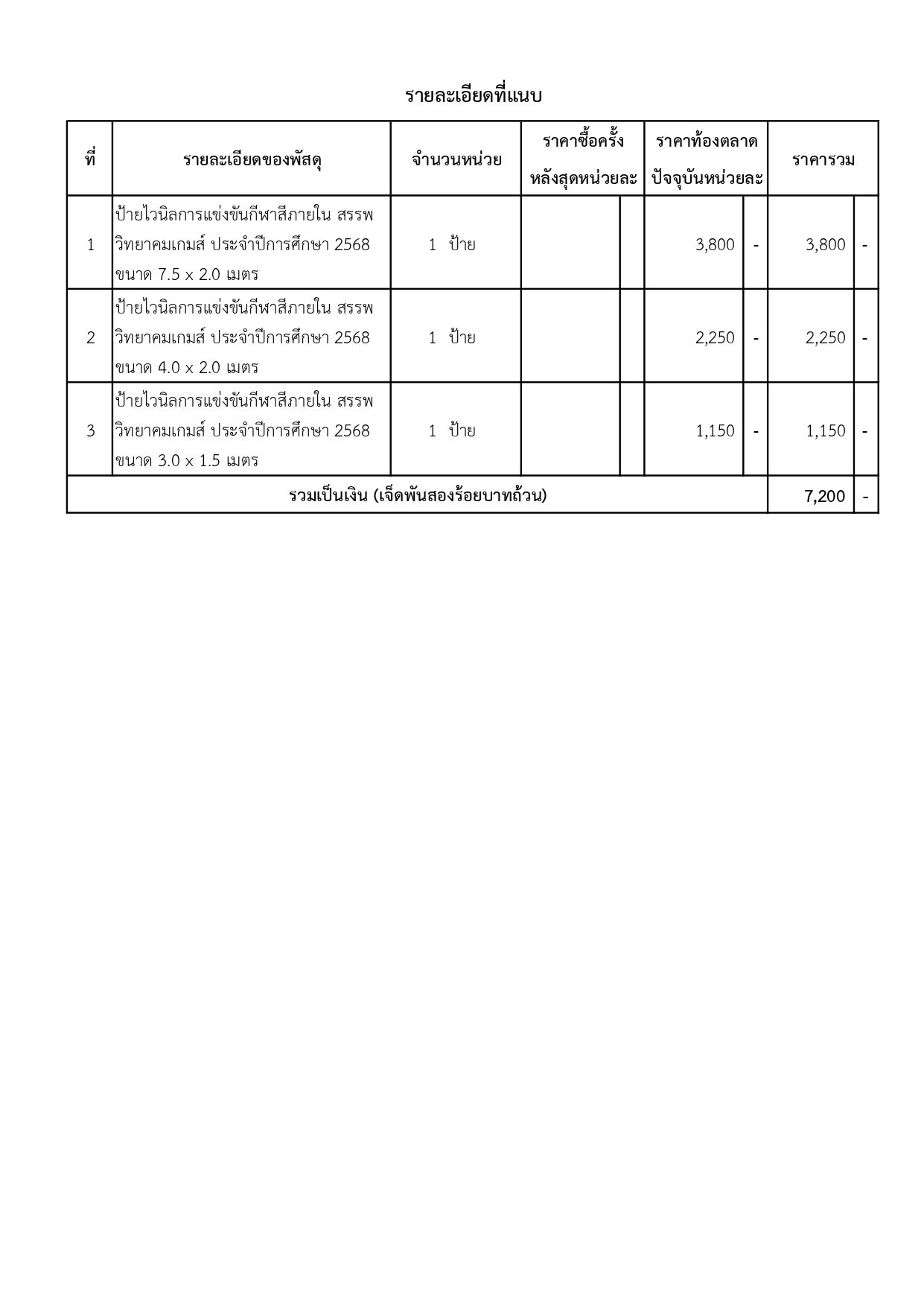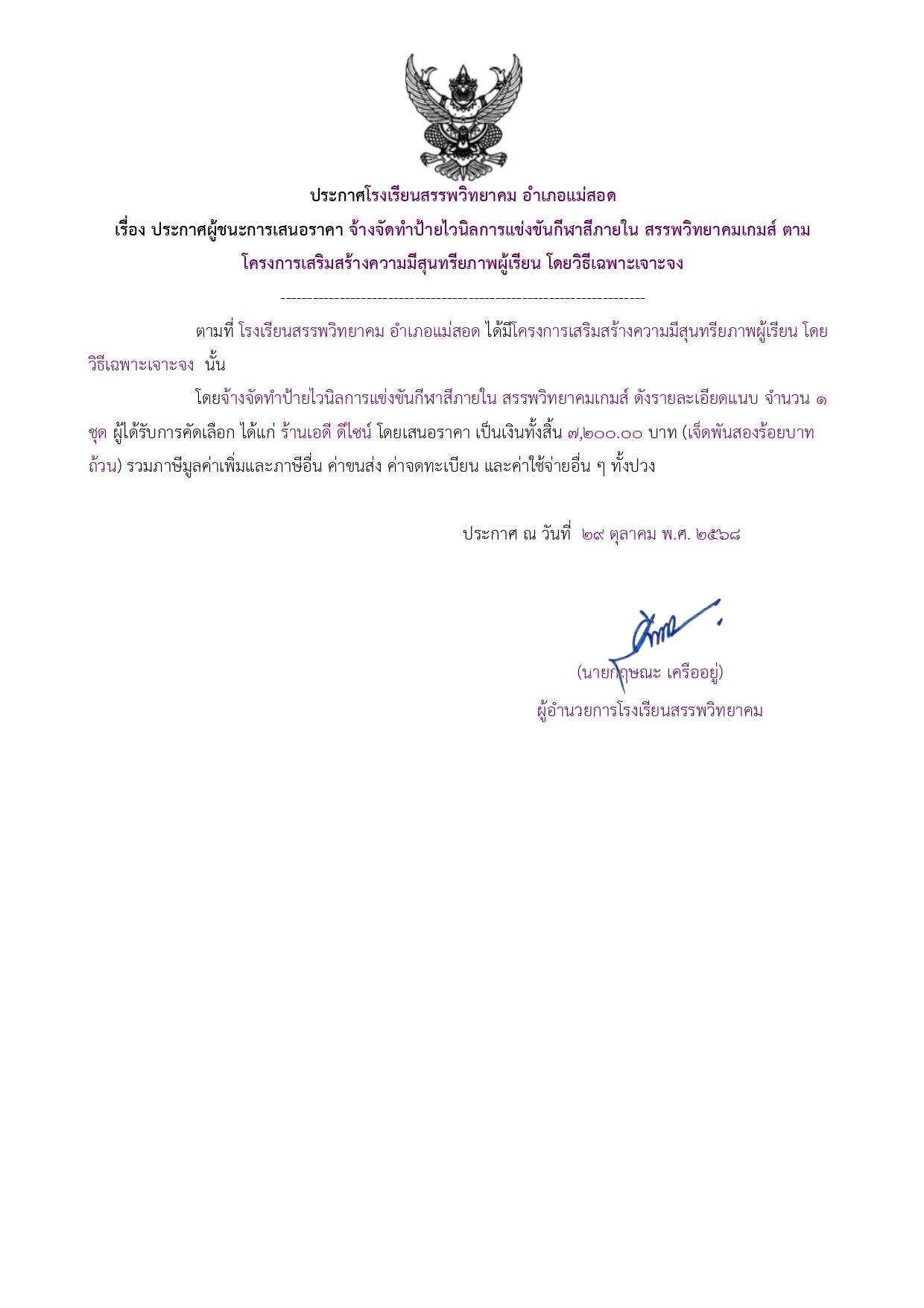 ประกาศผู้ชนะการเสนอราคา จ้างจัดทำป้ายไวนิลการแข่งขันกีฬาสีภายใน สรรพวิทยาคมเกมส์ ตามโครงการเสริมสร้างความมีสุนทรียภาพผู้เรียน โดยวิธีเฉพาะเจาะจง