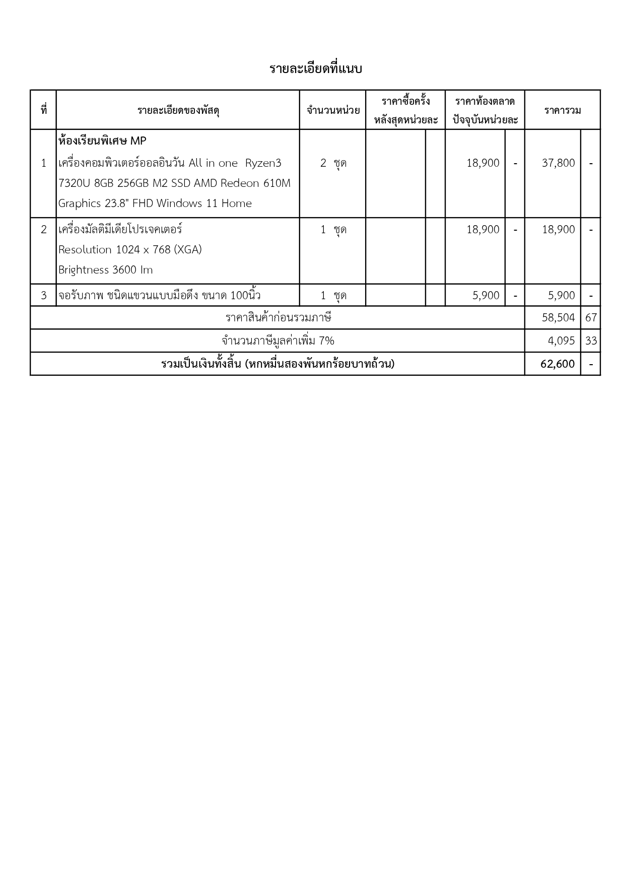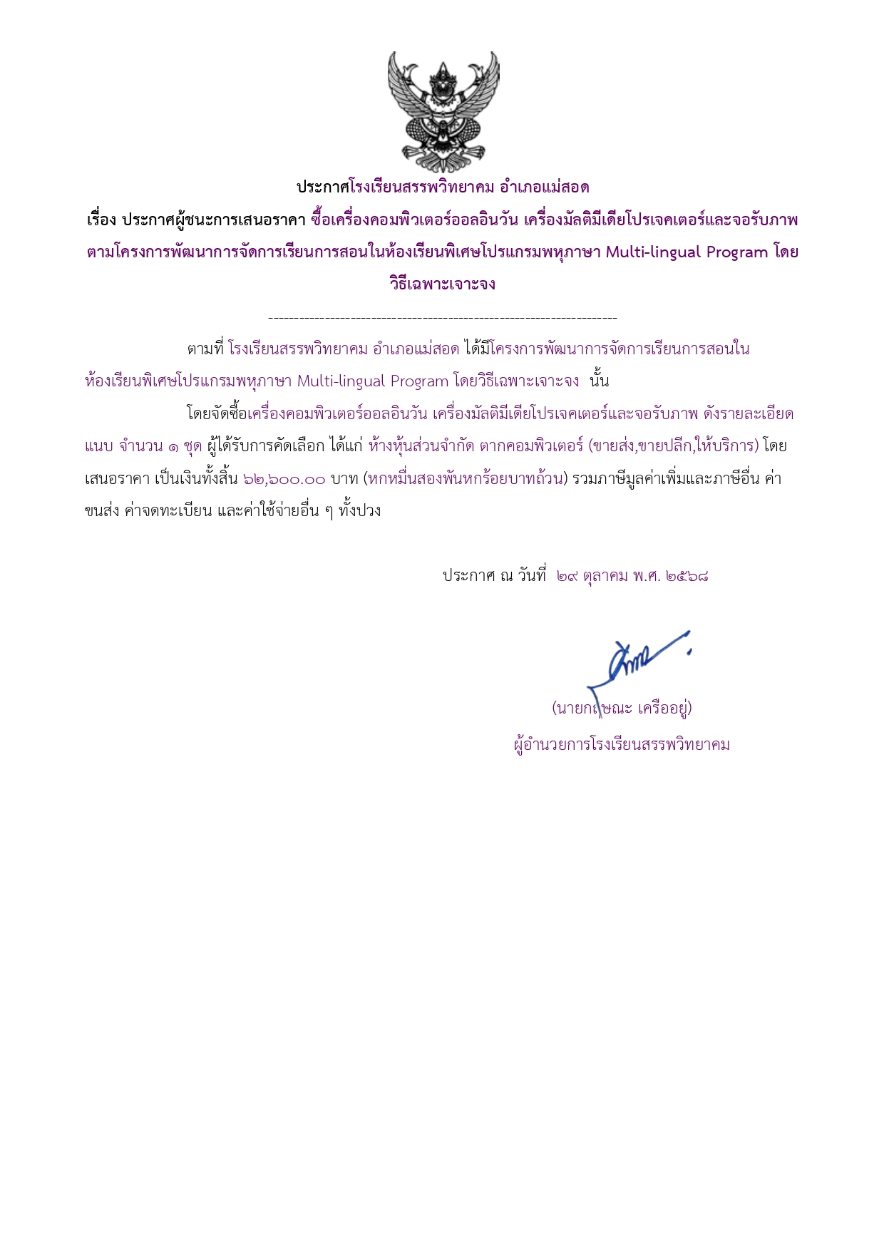 ประกาศผู้ชนะการเสนอราคา ซื้อเครื่องคอมพิวเตอร์ออลอินวัน เครื่องมัลติมีเดียโปรเจคเตอร์และจอรับภาพ ตามโครงการพัฒนาการจัดการเรียนการสอนในห้องเรียนพิเศษโปรแกรมพหุภาษา Multi-lingual Program โดยวิธีเฉพาะเจาะจง
