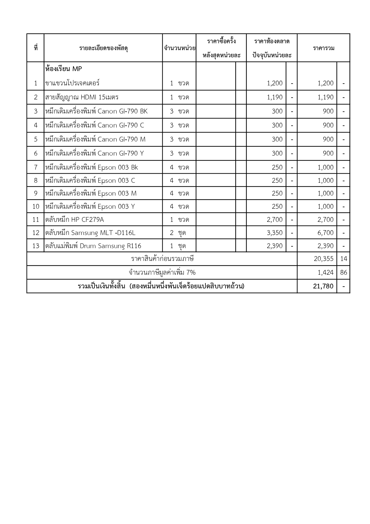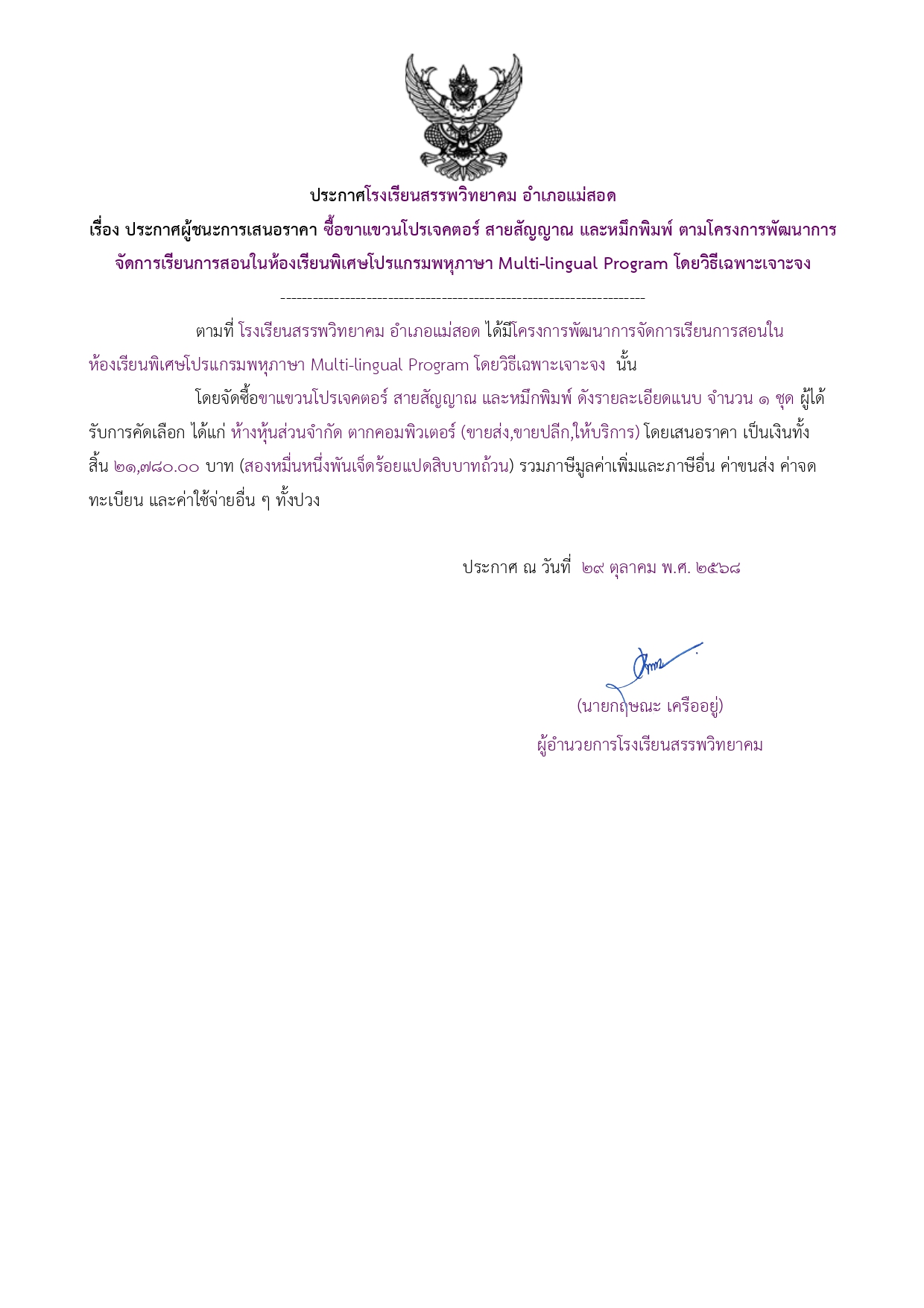 ประกาศผู้ชนะการเสนอราคา ซื้อขาแขวนโปรเจคตอร์ สายสัญญาณ และหมึกพิมพ์ ตามโครงการพัฒนาการจัดการเรียนการสอนในห้องเรียนพิเศษโปรแกรมพหุภาษา Multi-lingual Program โดยวิธีเฉพาะเจาะจง
