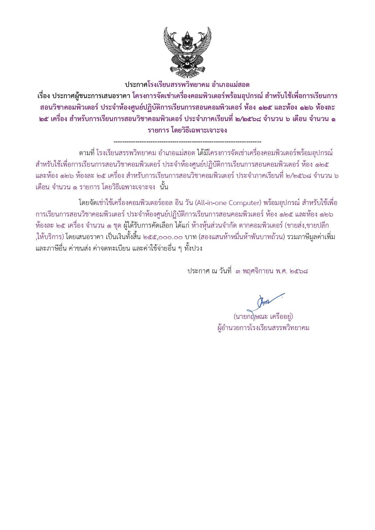 ประกาศผู้ชนะการเสนอราคา เช่าโครงการจัดเช่าเครื่องคอมพิวเตอร์พร้อมอุปกรณ์ สำหรับใช้เพื่อการเรียนการสอนวิชาคอมพิวเตอร์ ประจำห้องศูนย์ปฏิบัติการเรียนการสอนคอมพิวเตอร์ ห้อง ๑๒๕ และห้อง ๑๒๖ ห้องละ ๒๕ เครื่อง สำหรับการเรียนการสอนวิชาคอมพิวเตอร์ ประจำภาคเรียนที่ ๒/๒๕๖๘ จำนวน ๖ เดือน จำนวน ๑ รายการ โดยวิธีเฉพาะเจาะจง