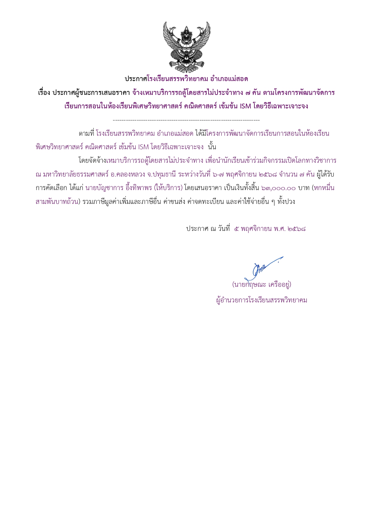ประกาศผู้ชนะการเสนอราคา จ้างเหมาบริการรถตู้โดยสารไม่ประจำทาง ๗ คัน ตามโครงการพัฒนาจัดการเรียนการสอนในห้องเรียนพิเศษวิทยาศาสตร์ คณิตศาสตร์ เข้มข้น ISM โดยวิธีเฉพาะเจาะจง