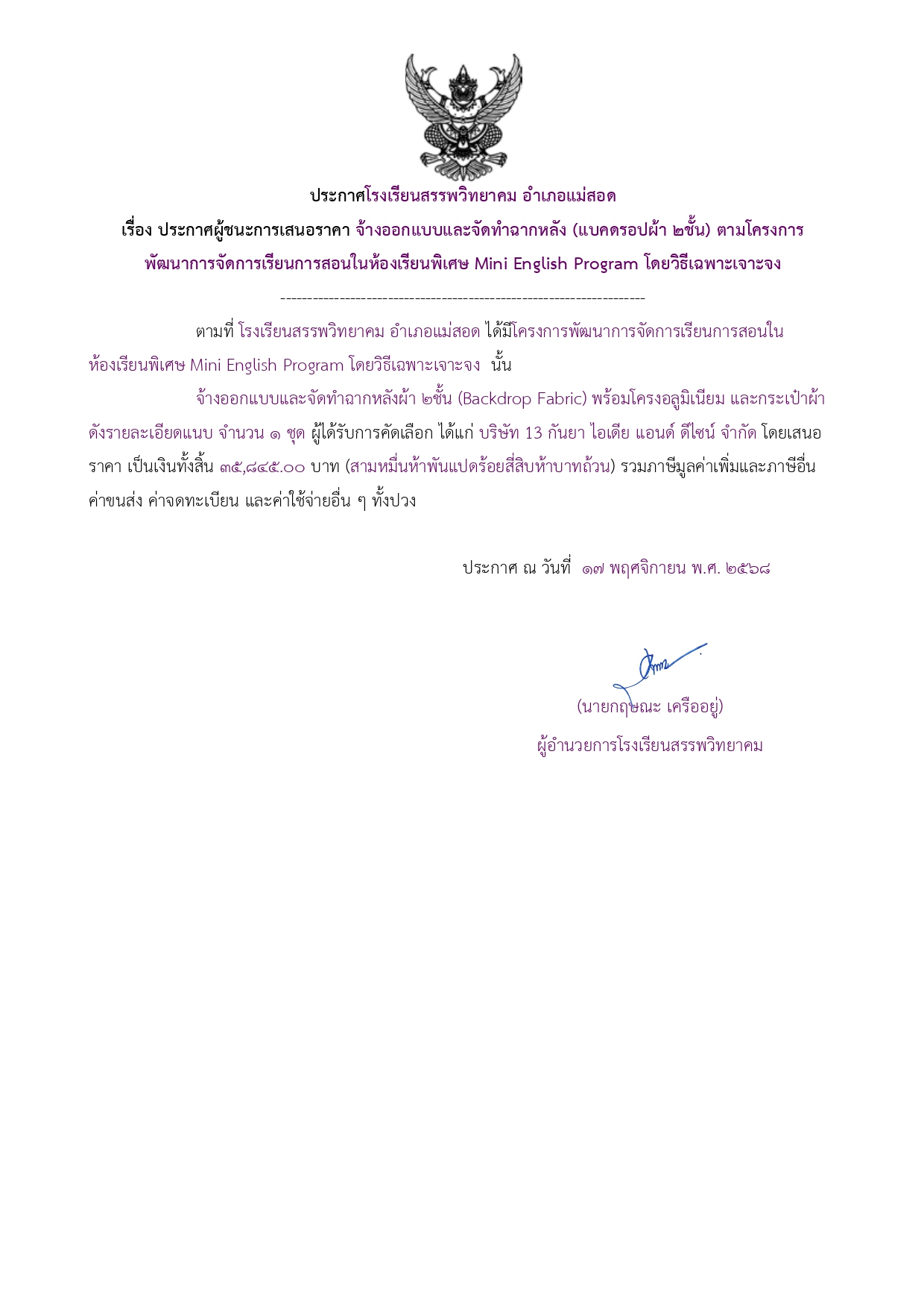 ประกาศผู้ชนะการเสนอราคา จ้างออกแบบและจัดทำฉากหลัง (แบคดรอปผ้า ๒ชั้น) ตามโครงการพัฒนาการจัดการเรียนการสอนในห้องเรียนพิเศษ Mini English Program โดยวิธีเฉพาะเจาะจง
