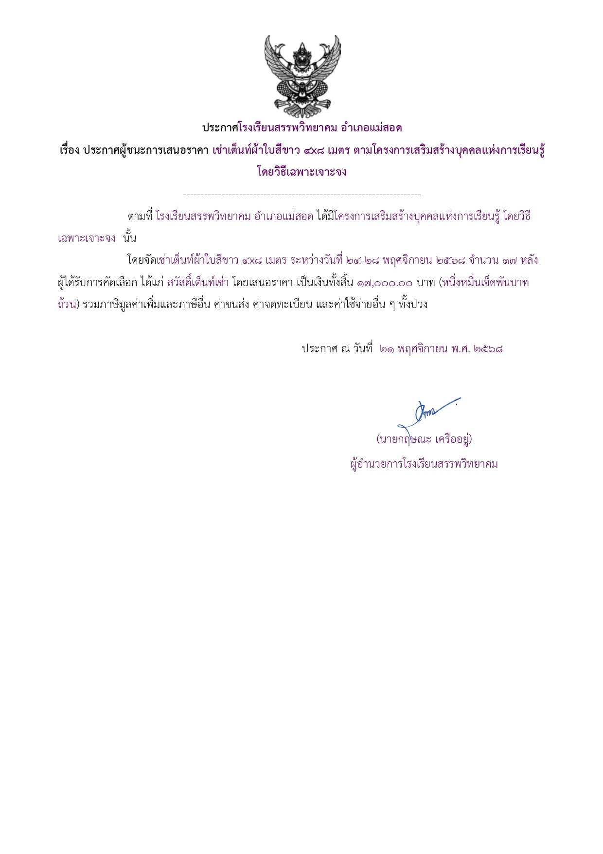 ประกาศผู้ชนะการเสนอราคา เช่าเต็นท์ผ้าใบสีขาว ๔x๘ เมตร ตามโครงการเสริมสร้างบุคคลแห่งการเรียนรู้ โดยวิธีเฉพาะเจาะจง