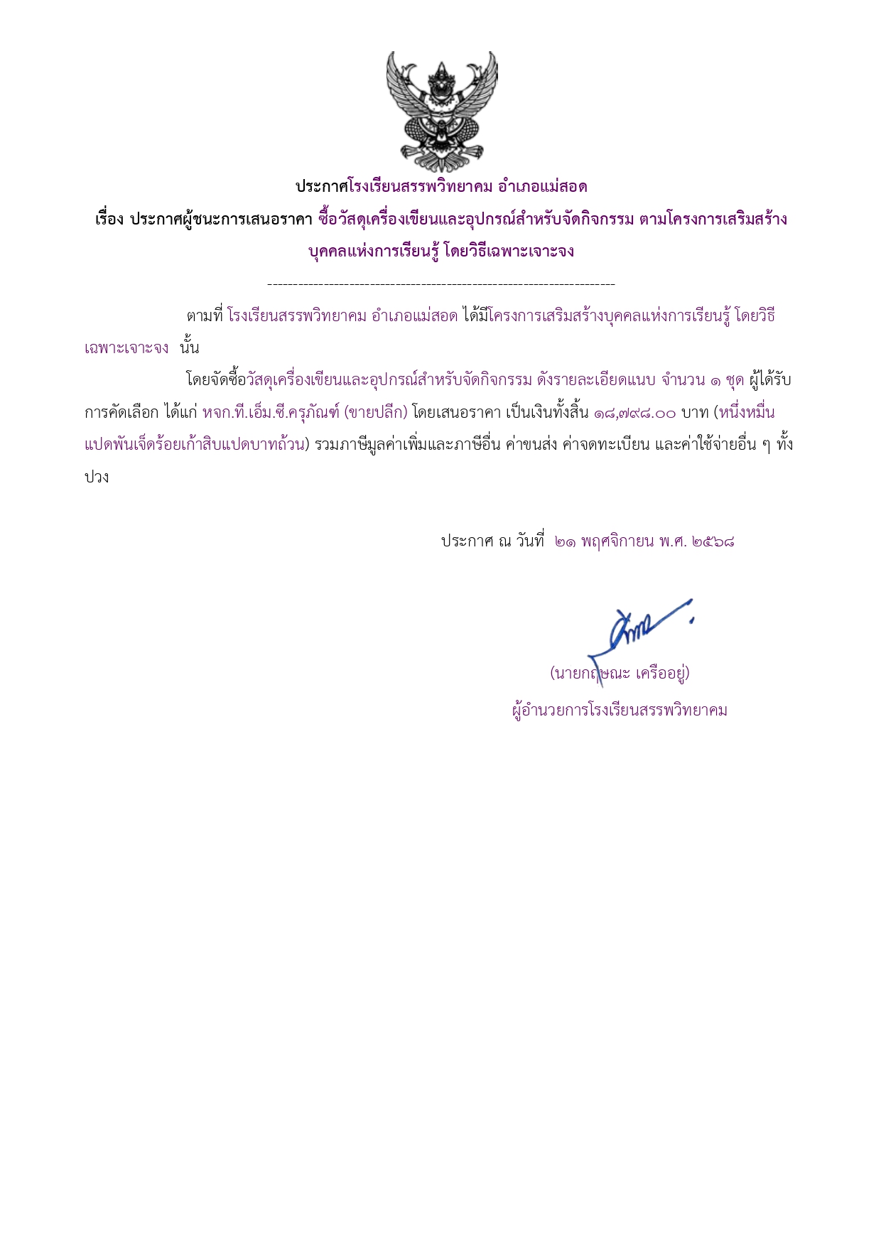 ประกาศผู้ชนะการเสนอราคา ซื้อวัสดุเครื่องเขียนและอุปกรณ์สำหรับจัดกิจกรรม ตามโครงการเสริมสร้างบุคคลแห่งการเรียนรู้