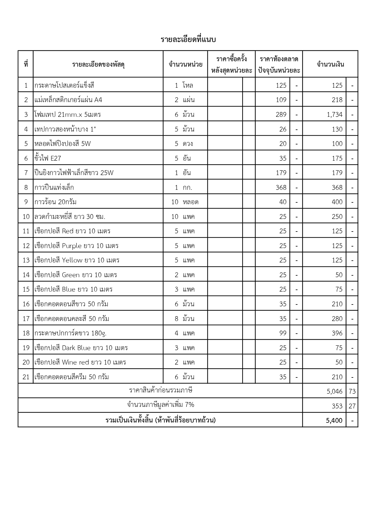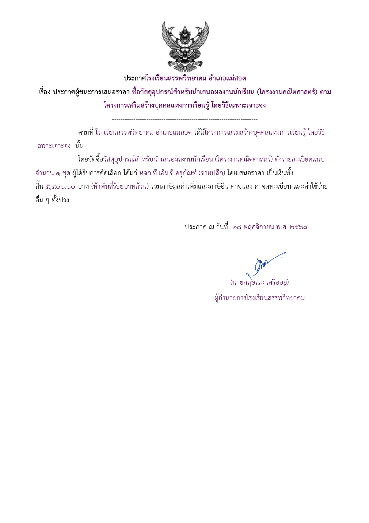 ประกาศผู้ชนะการเสนอราคา ซื้อวัสดุอุปกรณ์สำหรับนำเสนอผลงานนักเรียน (โครงงานคณิตศาสตร์) ตามโครงการเสริมสร้างบุคคลแห่งการเรียนรู้ โดยวิธีเฉพาะเจาะจง