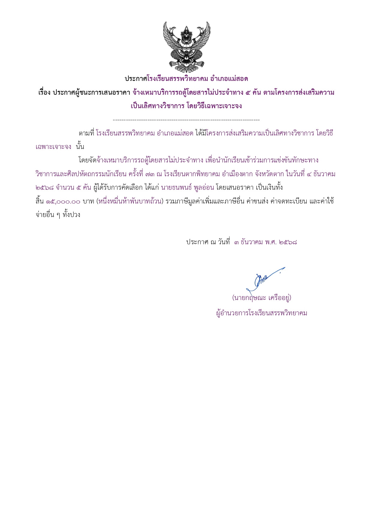 ประกาศผู้ชนะการเสนอราคา จ้างเหมาบริการรถตู้โดยสารไม่ประจำทาง ๕ คัน ตามโครงการส่งเสริมความเป็นเลิศทางวิชาการ