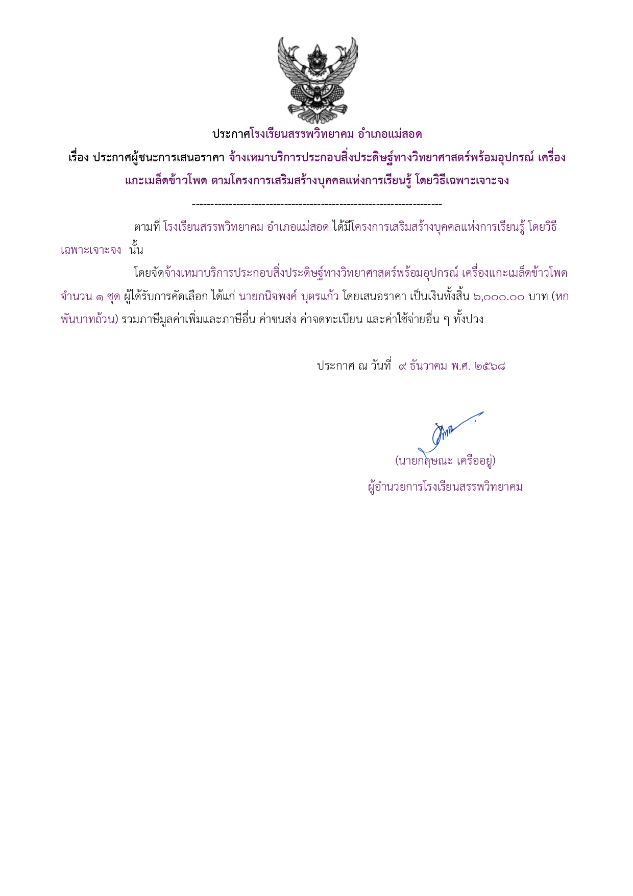 ประกาศผู้ชนะการเสนอราคา จ้างเหมาบริการประกอบสิ่งประดิษฐ์ทางวิทยาศาสตร์พร้อมอุปกรณ์ เครื่องแกะเมล็ดข้าวโพด ตามโครงการเสริมสร้างบุคคลแห่งการเรียนรู้ โดยวิธีเฉพาะเจาะจง