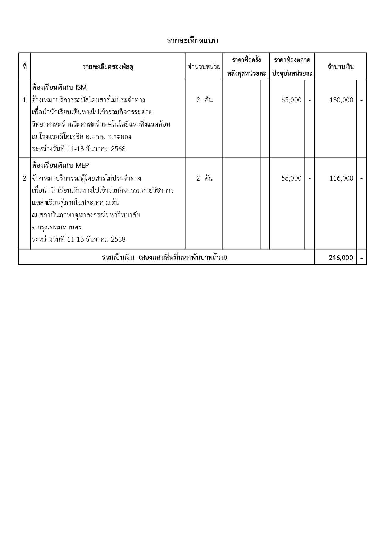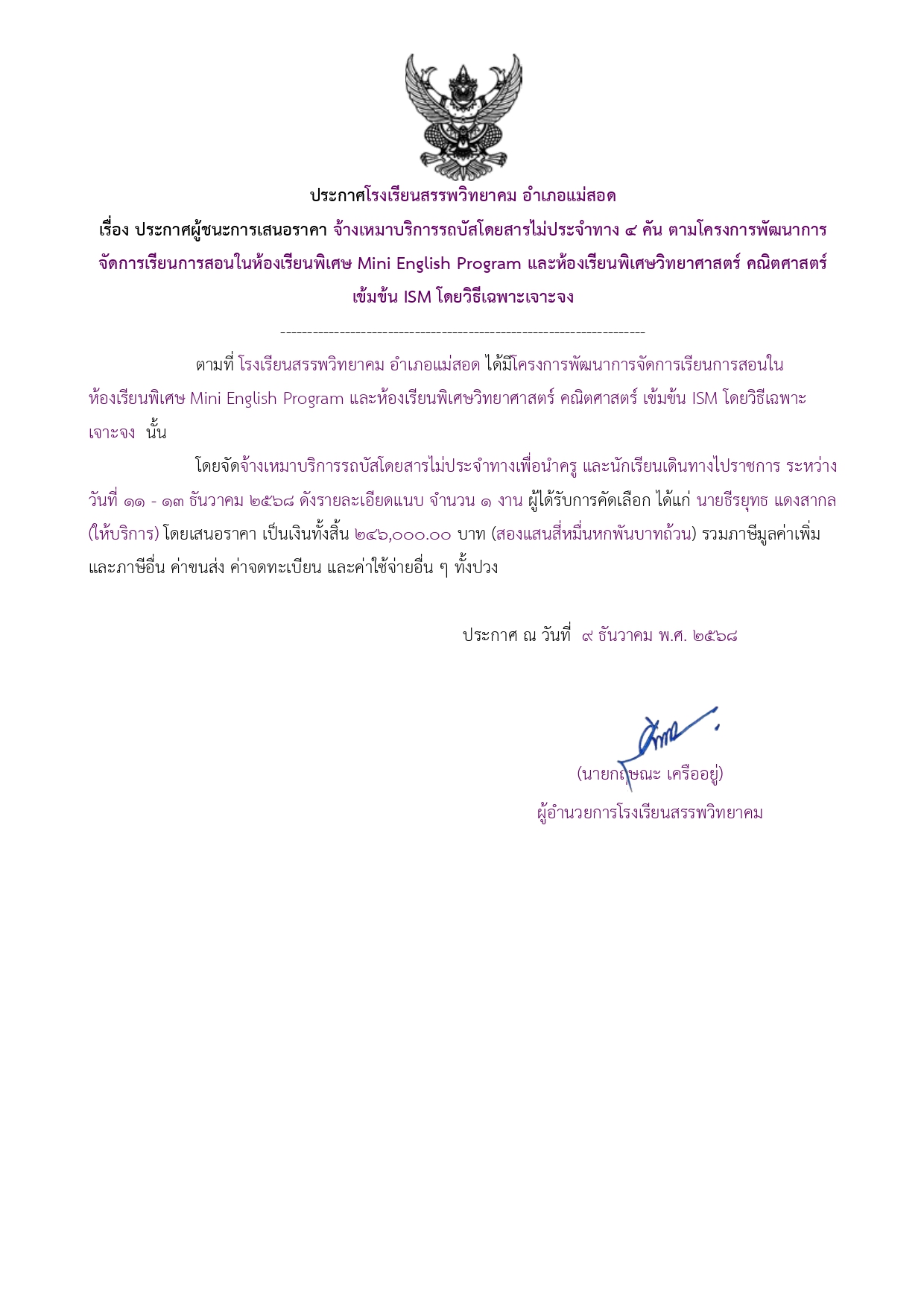 ประกาศผู้ชนะการเสนอราคา จ้างเหมาบริการรถบัสโดยสารไม่ประจำทาง ๔ คัน ตามโครงการพัฒนาการจัดการเรียนการสอนในห้องเรียนพิเศษ Mini English Program และห้องเรียนพิเศษวิทยาศาสตร์ คณิตศาสตร์ เข้มข้น ISM โดยวิธีเฉพาะเจาะจง