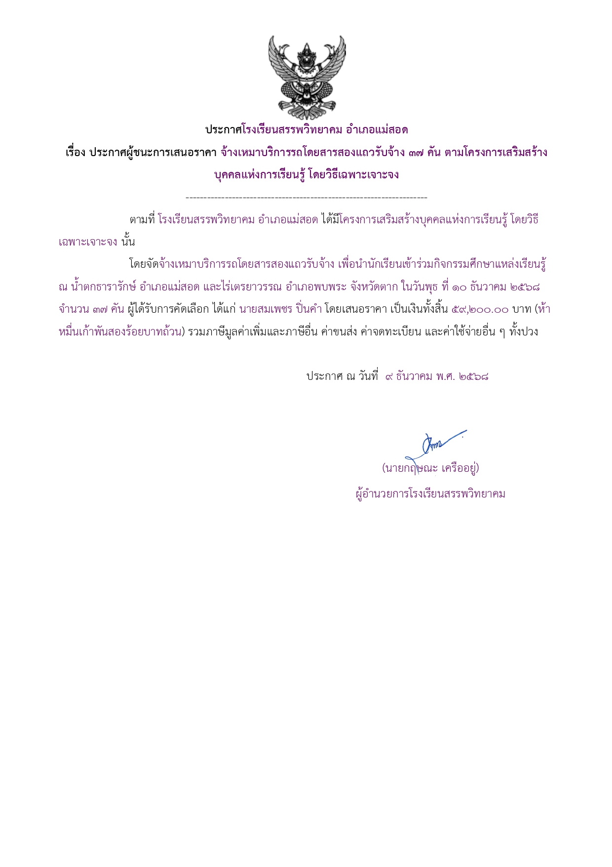 ประกาศผู้ชนะการเสนอราคา จ้างเหมาบริการรถโดยสารสองแถวรับจ้าง ๓๗ คัน ตามโครงการเสริมสร้างบุคคลแห่งการเรียนรู้