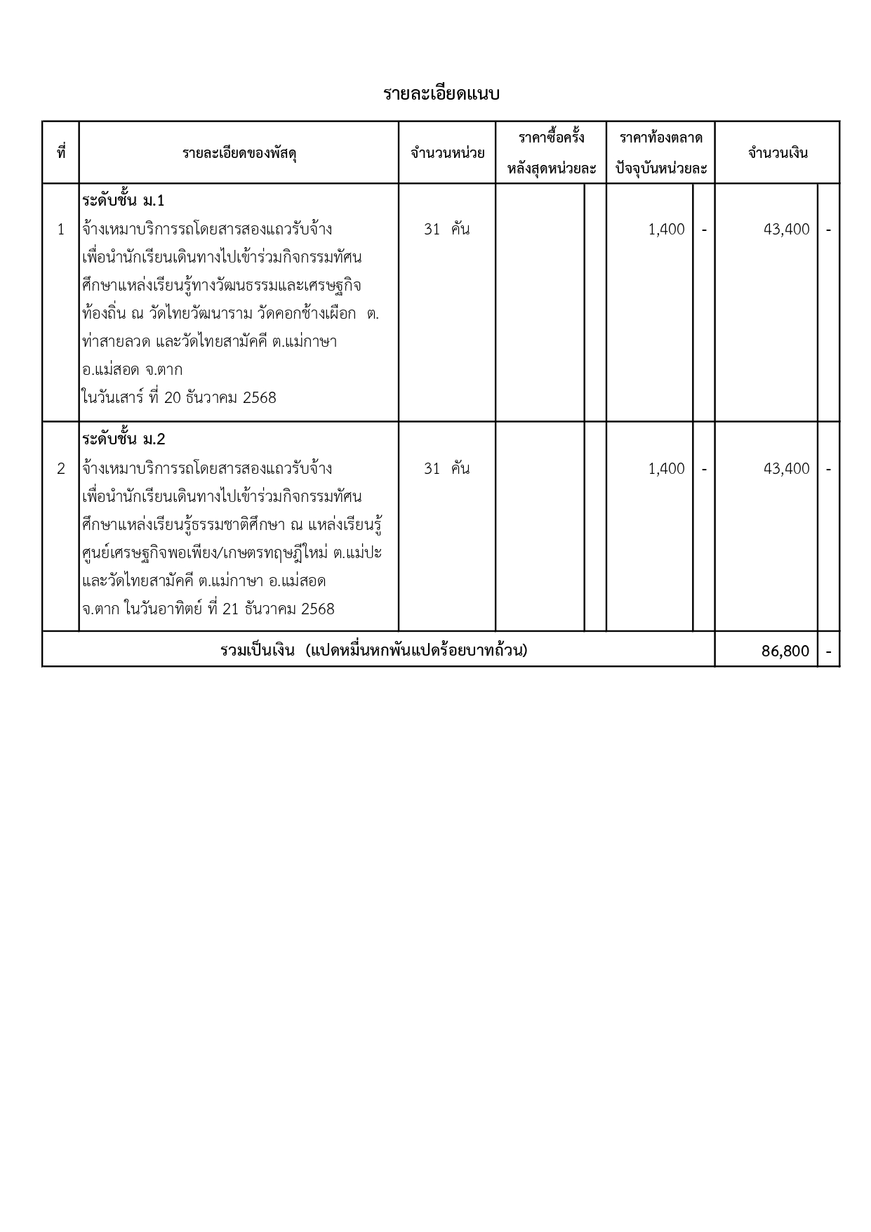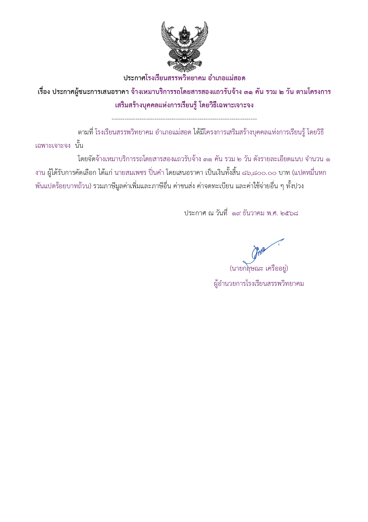 ประกาศผู้ชนะการเสนอราคา จ้างเหมาบริการรถโดยสารสองแถวรับจ้าง ๓๑ คัน รวม ๒ วัน ตามโครงการเสริมสร้างบุคคลแห่งการเรียนรู้ โดยวิธีเฉพาะเจาะจง