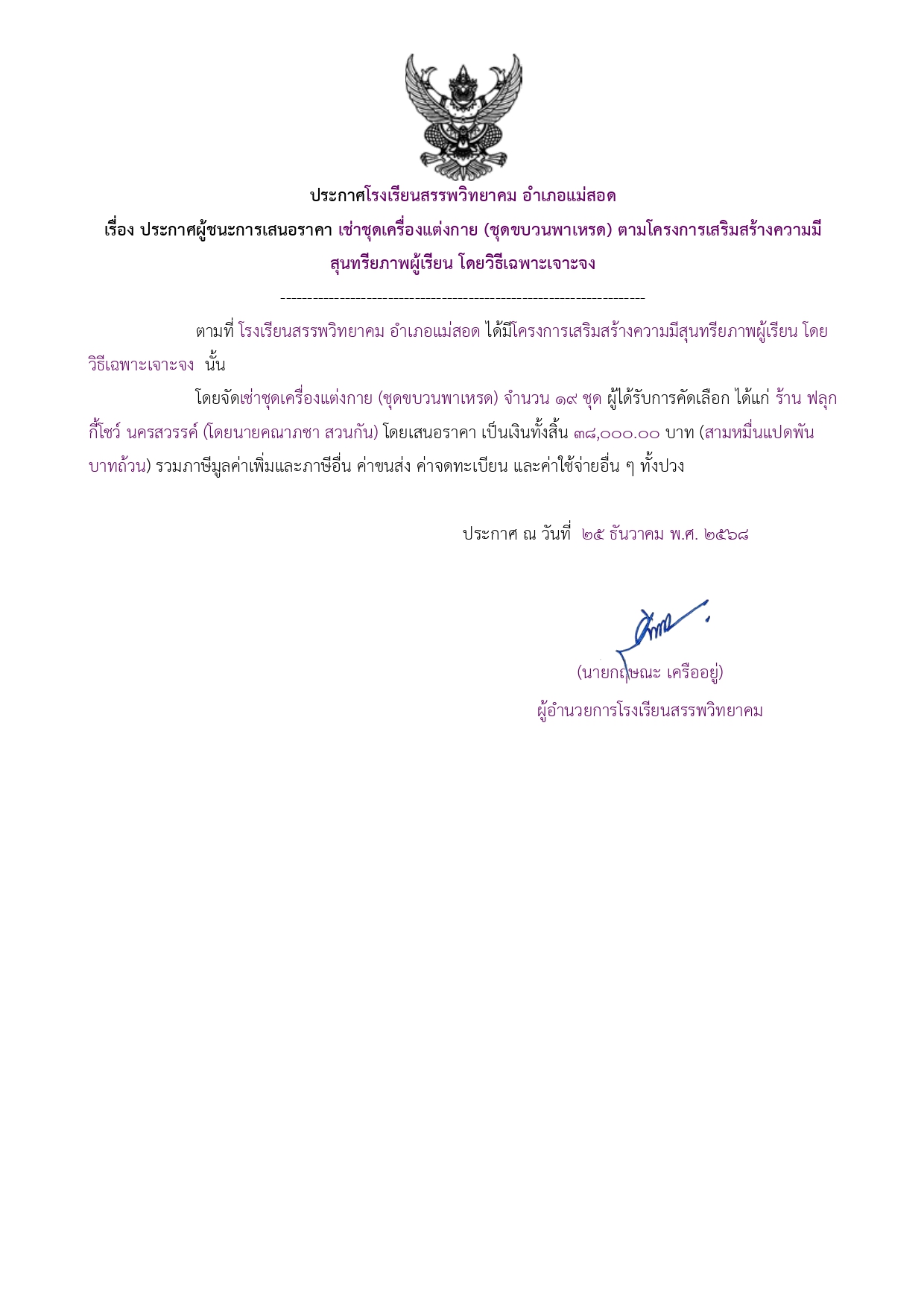 ประกาศผู้ชนะการเสนอราคา เช่าชุดเครื่องแต่งกาย (ชุดขบวนพาเหรด) ตามโครงการเสริมสร้างความมีสุนทรียภาพผู้เรียน