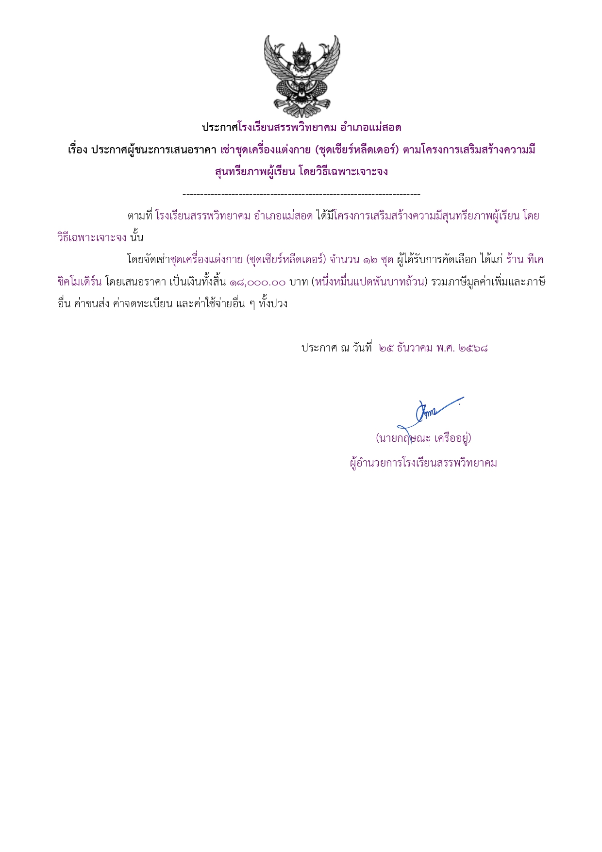 ประกาศผู้ชนะการเสนอราคา เช่าชุดเครื่องแต่งกาย (ชุดเชียร์หลีดเดอร์) ตามโครงการเสริมสร้างความมีสุนทรียภาพผู้เรียน