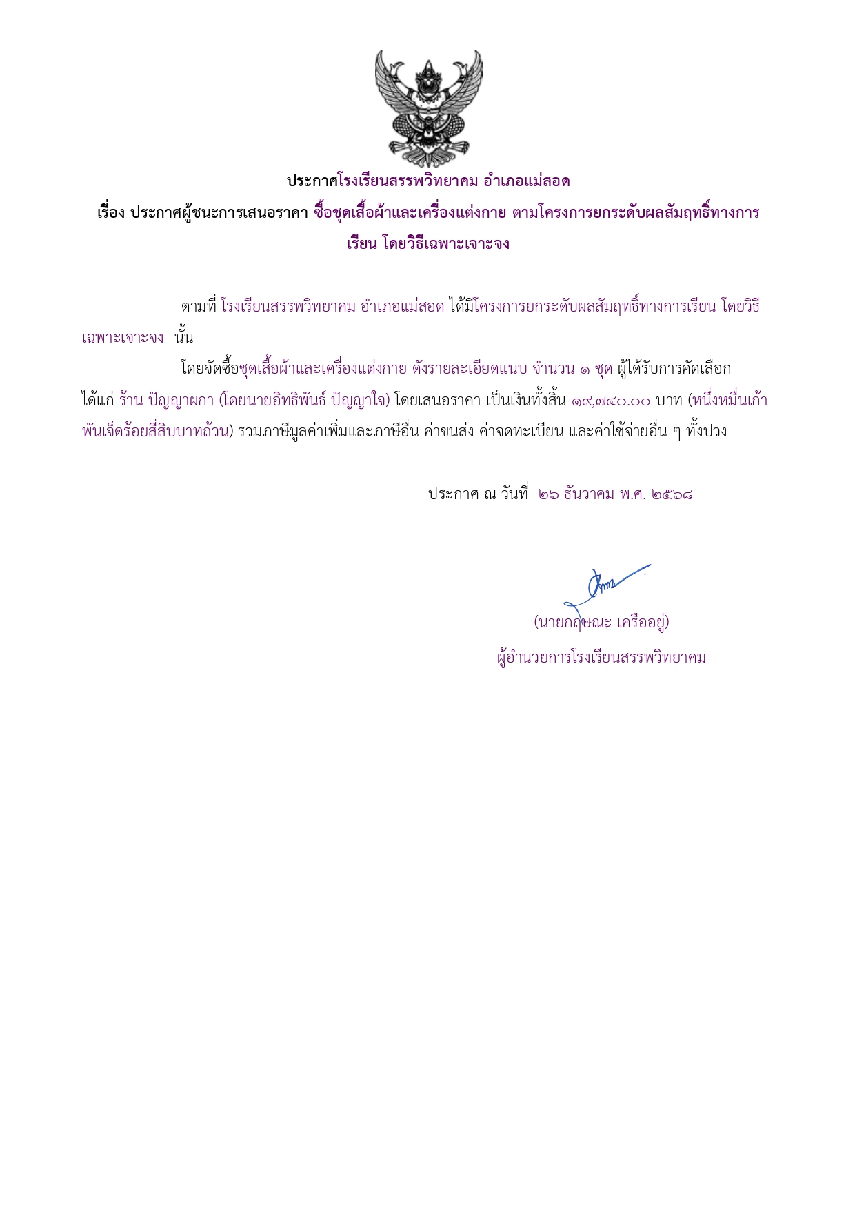 ประกาศผู้ชนะการเสนอราคา ซื้อชุดเสื้อผ้าและเครื่องแต่งกาย ตามโครงการยกระดับผลสัมฤทธิ์ทางการเรียน โดยวิธีเฉพาะเจาะจง