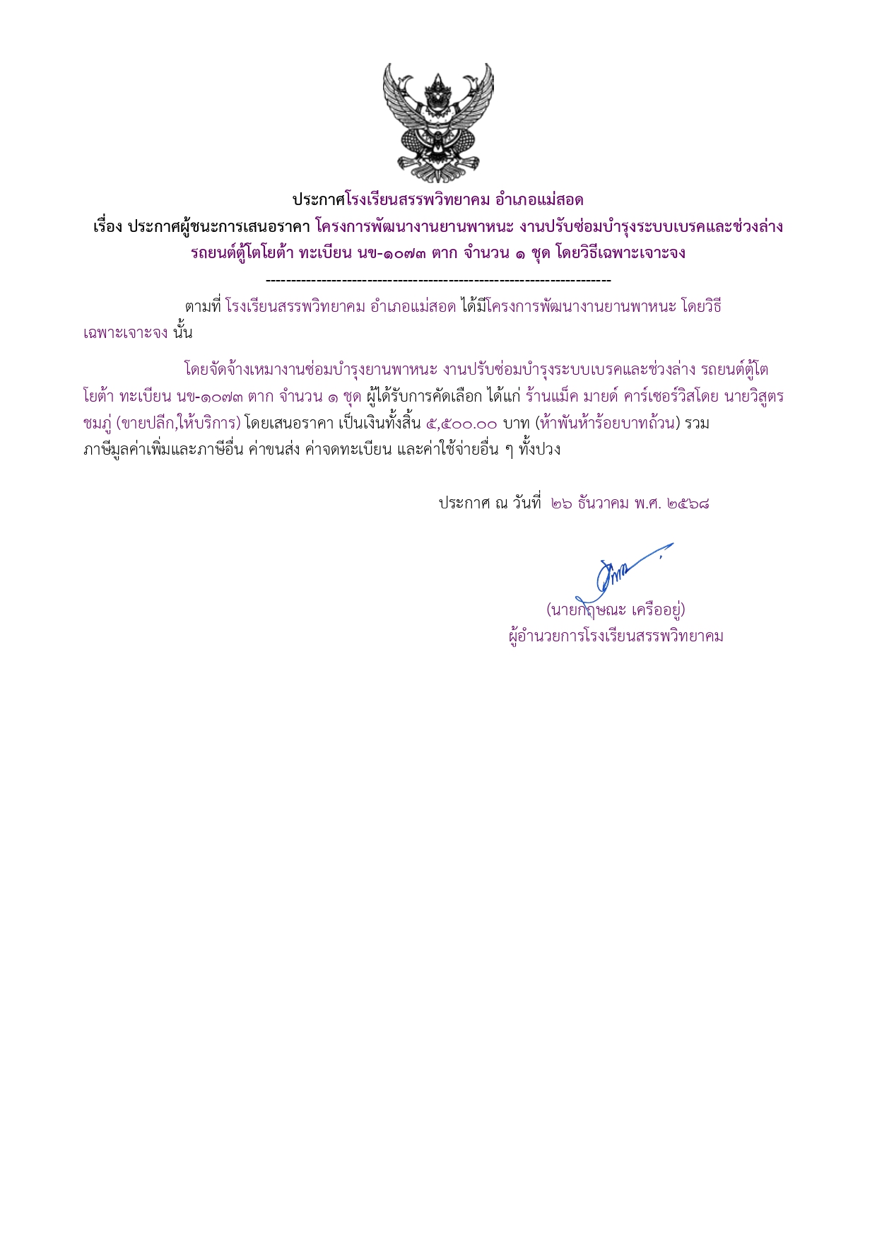 ประกาศผู้ชนะการเสนอราคา จ้างโครงการพัฒนางานยานพาหนะ งานปรับซ่อมบำรุงระบบเบรคและช่วงล่างรถยนต์ตู้โตโยต้า ทะเบียน นข-๑๐๗๓ ตาก จำนวน ๑ ชุด โดยวิธีเฉพาะเจาะจง
