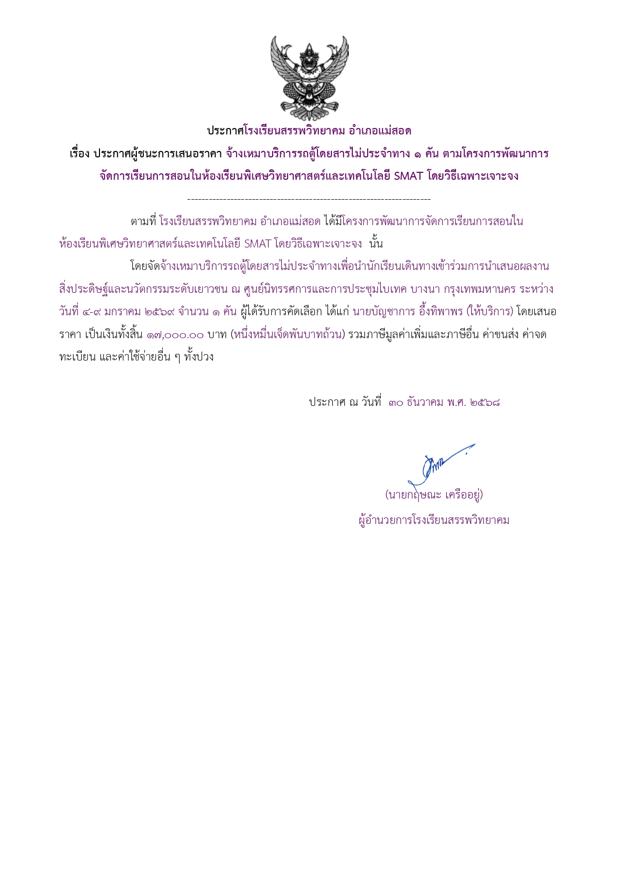 ประกาศผู้ชนะการเสนอราคา จ้างเหมาบริการรถตู้โดยสารไม่ประจำทาง ๑ คัน ตามโครงการพัฒนาการจัดการเรียนการสอนในห้องเรียนพิเศษวิทยาศาสตร์และเทคโนโลยี SMAT โดยวิธีเฉพาะเจาะจง
