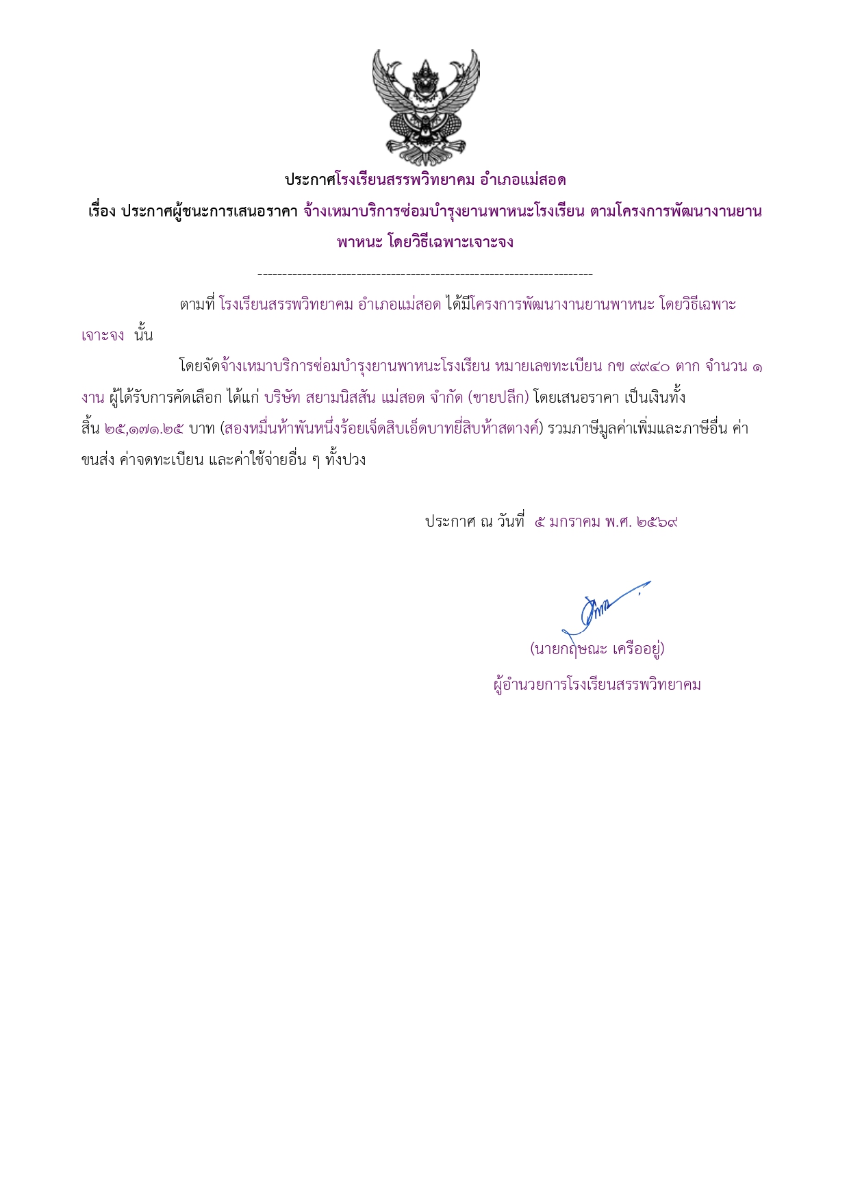 ประกาศผู้ชนะการเสนอราคา จ้างเหมาบริการซ่อมบำรุงยานพาหนะโรงเรียน ตามโครงการพัฒนางานยานพาหนะ