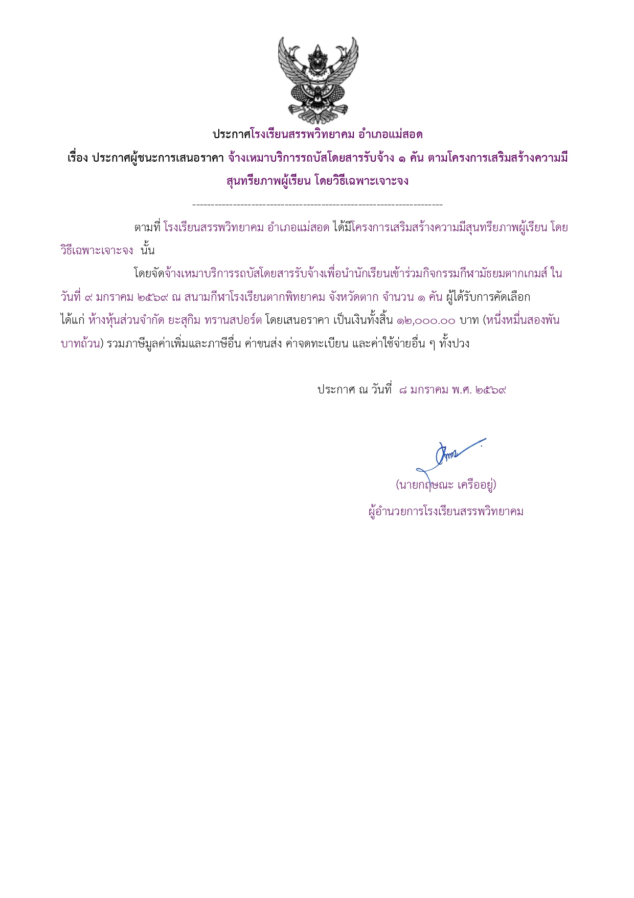 ประกาศผู้ชนะการเสนอราคา จ้างเหมาบริการรถบัสโดยสารรับจ้าง ๑ คัน ตามโครงการเสริมสร้างความมีสุนทรียภาพผู้เรียน โดยวิธีเฉพาะเจาะจง