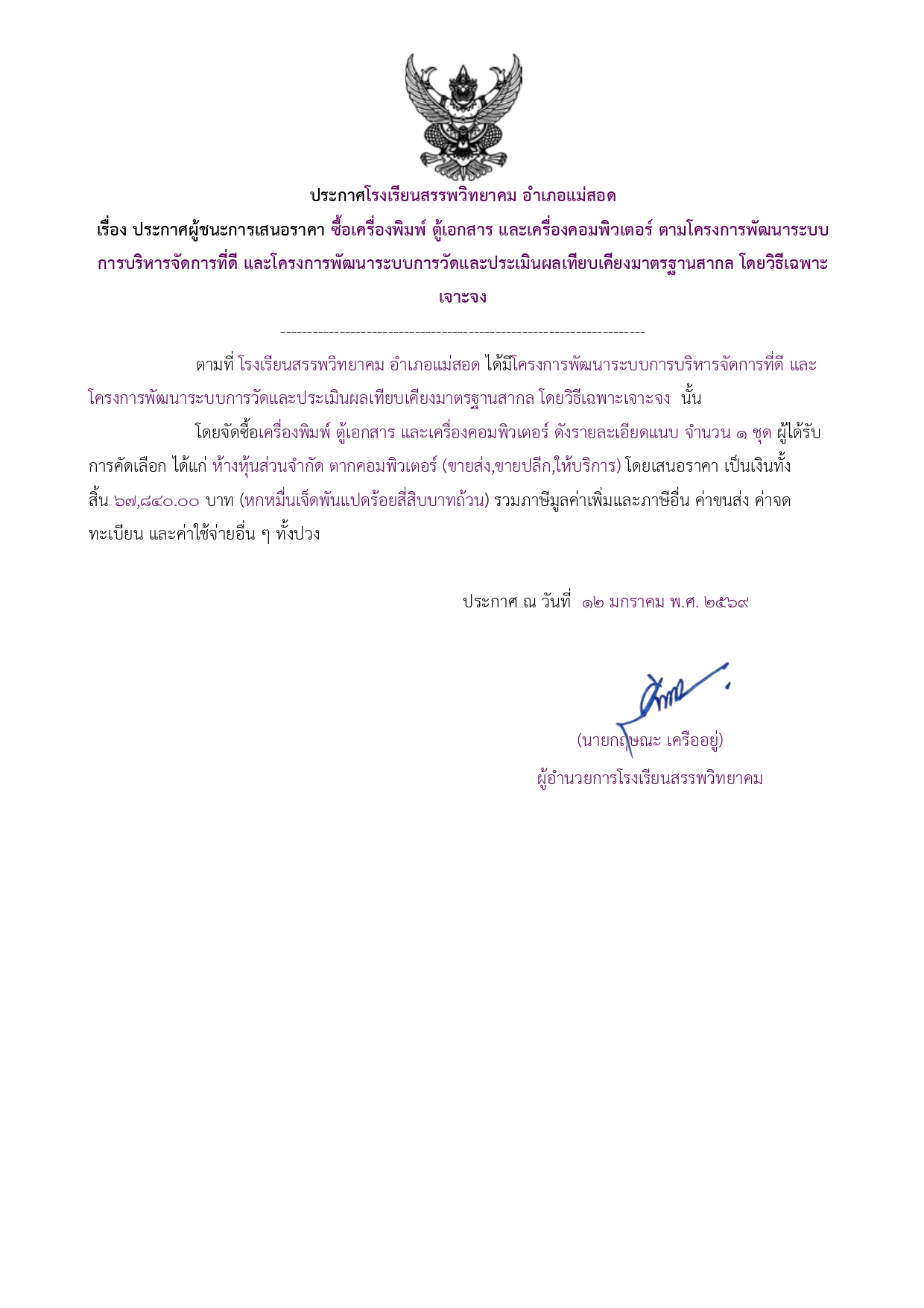 ประกาศผู้ชนะการเสนอราคา ซื้อเครื่องพิมพ์ ตู้เอกสาร และเครื่องคอมพิวเตอร์ ตามโครงการพัฒนาระบบการบริหารจัดการที่ดี และโครงการพัฒนาระบบการวัดและประเมินผลเทียบเคียงมาตรฐานสากล โดยวิธีเฉพาะเจาะจง
