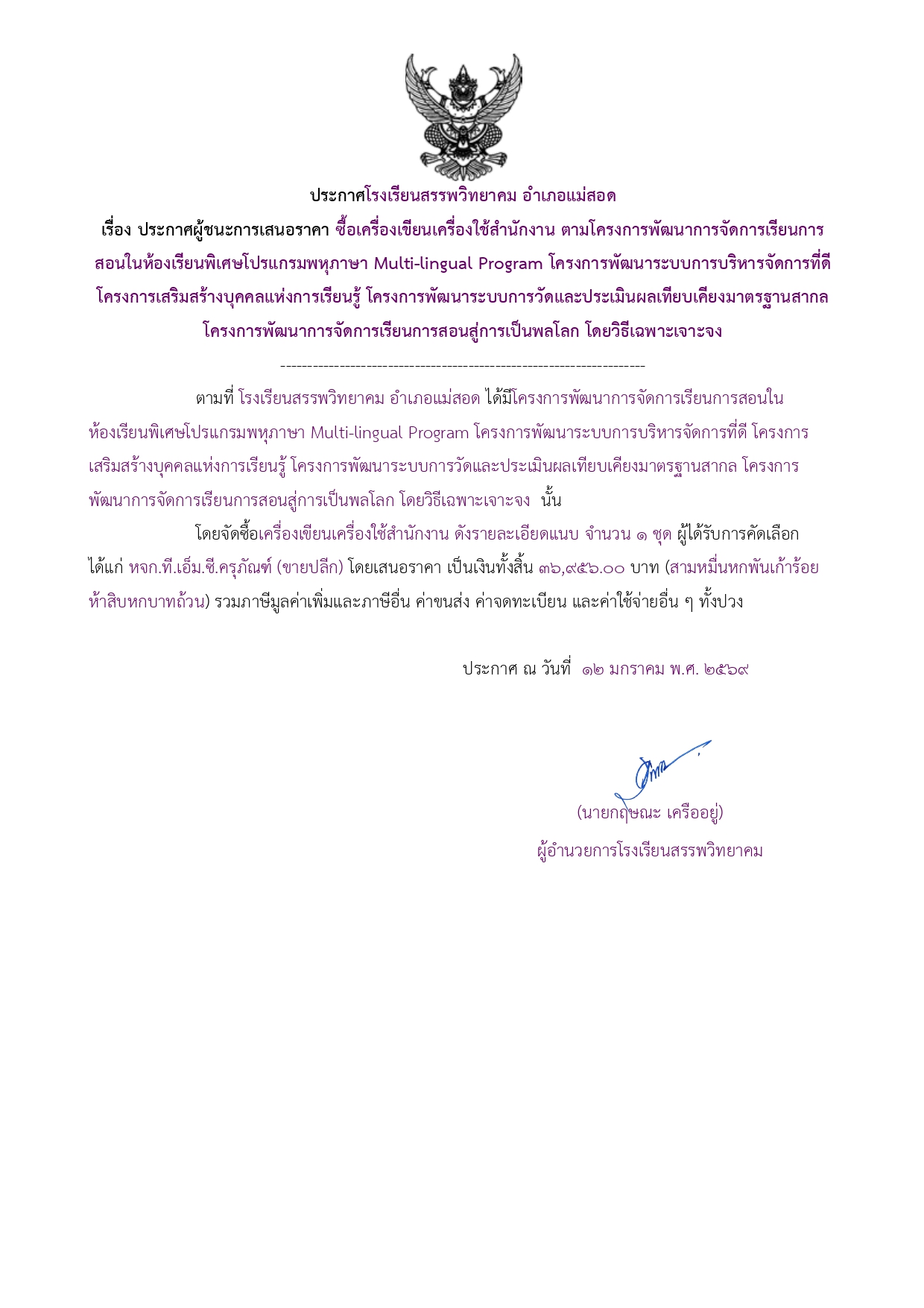 ประกาศผู้ชนะการเสนอราคา ซื้อเครื่องเขียนเครื่องใช้สำนักงาน ตามโครงการพัฒนาการจัดการเรียนการสอนในห้องเรียนพิเศษโปรแกรมพหุภาษา Multi-lingual Program โครงการพัฒนาระบบการบริหารจัดการที่ดี โครงการเสริมสร้างบุคคลแห่งการเรียนรู้ โครงการพัฒนาระบบการวัดและประเมินผลเทียบเคียงมาตรฐานสากล โครงการพัฒนาการจัดการเรียนการสอนสู่การเป็นพลโลก โดยวิธีเฉพาะเจาะจง