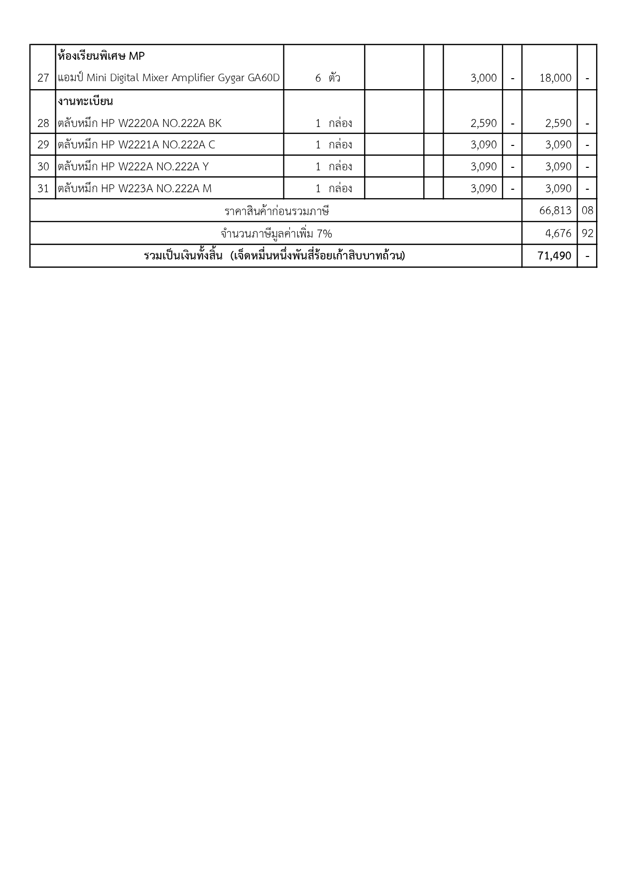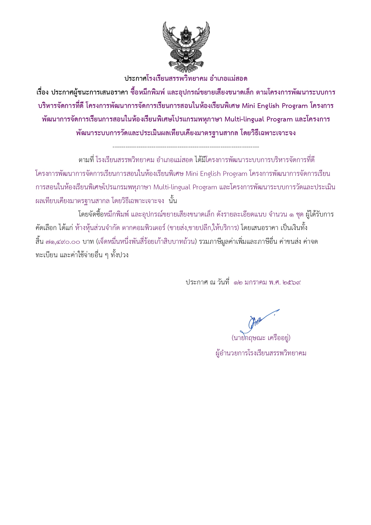 ประกาศผู้ชนะการเสนอราคา ซื้อหมึกพิมพ์ และอุปกรณ์ขยายเสียงขนาดเล็ก ตามโครงการพัฒนาระบบการบริหารจัดการที่ดี โครงการพัฒนาการจัดการเรียนการสอนในห้องเรียนพิเศษ Mini English Program โครงการพัฒนาการจัดการเรียนการสอนในห้องเรียนพิเศษโปรแกรมพหุภาษา Multi-lingual Program และโครงการพัฒนาระบบการวัดและประเมินผลเทียบเคียงมาตรฐานสากล โดยวิธีเฉพาะเจาะจง