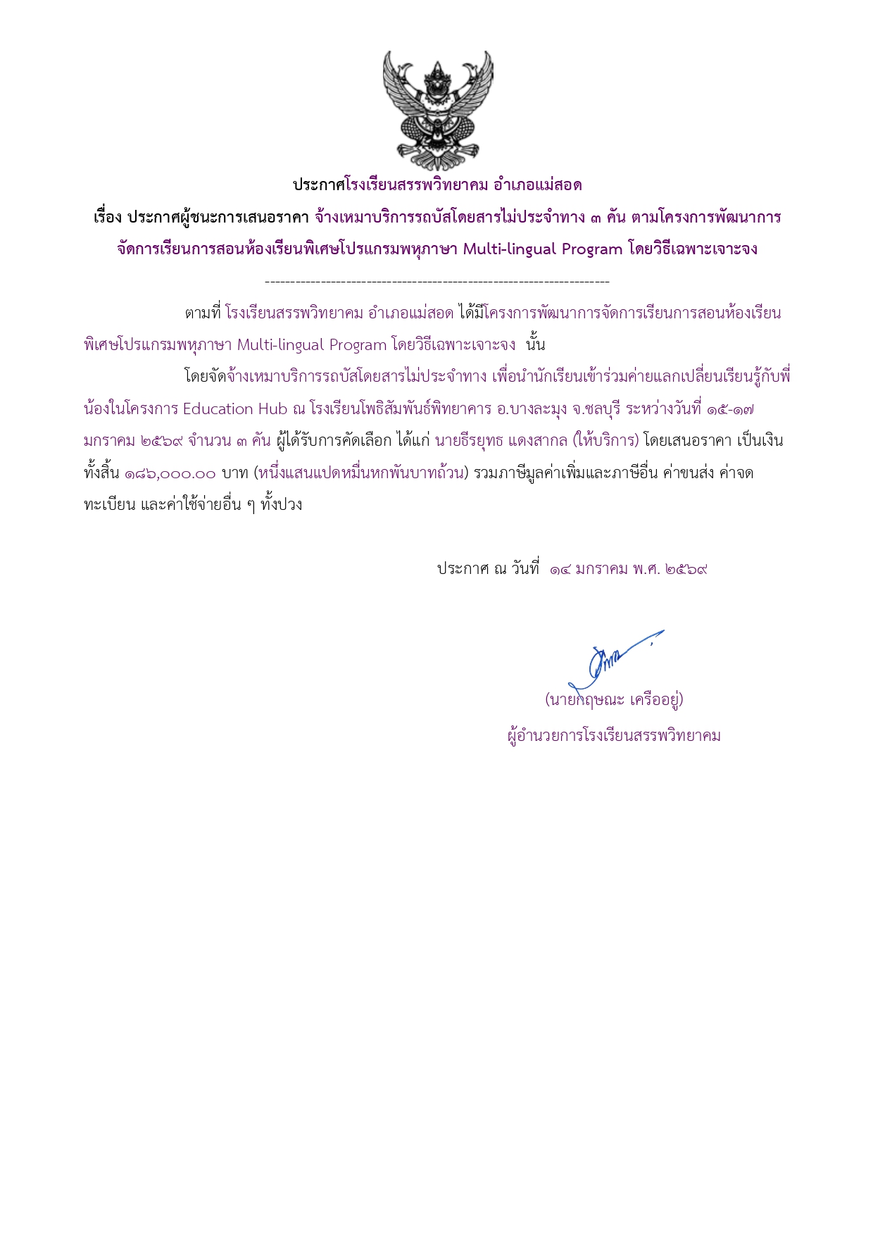 ประกาศผู้ชนะการเสนอราคา จ้างเหมาบริการรถบัสโดยสารไม่ประจำทาง ๓ คัน ตามโครงการพัฒนาการจัดการเรียนการสอนห้องเรียนพิเศษโปรแกรมพหุภาษา Multi-lingual Program โดยวิธีเฉพาะเจาะจง