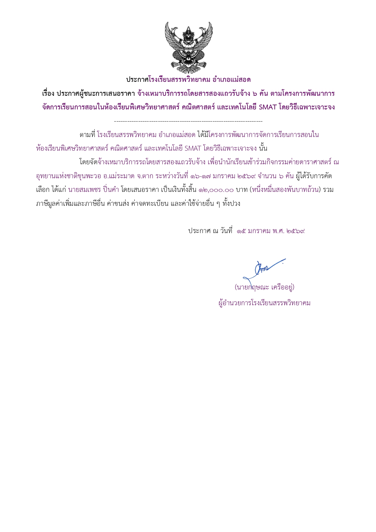 ประกาศผู้ชนะการเสนอราคา จ้างเหมาบริการรถโดยสารสองแถวรับจ้าง ๖ คัน ตามโครงการพัฒนาการจัดการเรียนการสอนในห้องเรียนพิเศษวิทยาศาสตร์ คณิตศาสตร์ และเทคโนโลยี SMAT โดยวิธีเฉพาะเจาะจง