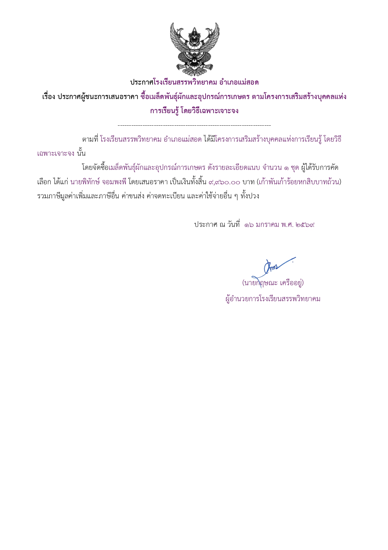ประกาศผู้ชนะการเสนอราคา ซื้อเมล็ดพันธุ์ผักและอุปกรณ์การเกษตร ตามโครงการเสริมสร้างบุคคลแห่งการเรียนรู้