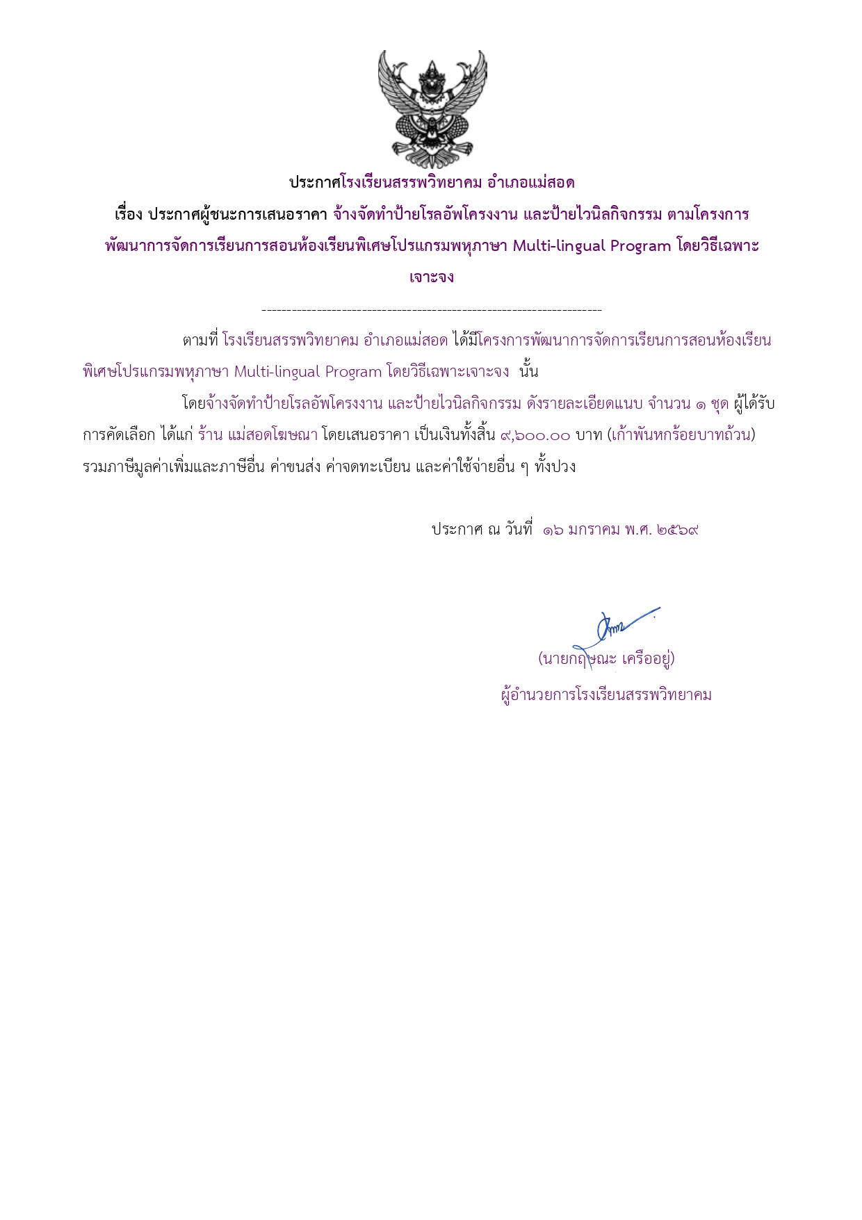 ประกาศผู้ชนะการเสนอราคา จ้างจัดทำป้ายโรลอัพโครงงาน และป้ายไวนิลกิจกรรม ตามโครงการพัฒนาการจัดการเรียนการสอนห้องเรียนพิเศษโปรแกรมพหุภาษา Multi-lingual Program โดยวิธีเฉพาะเจาะจง