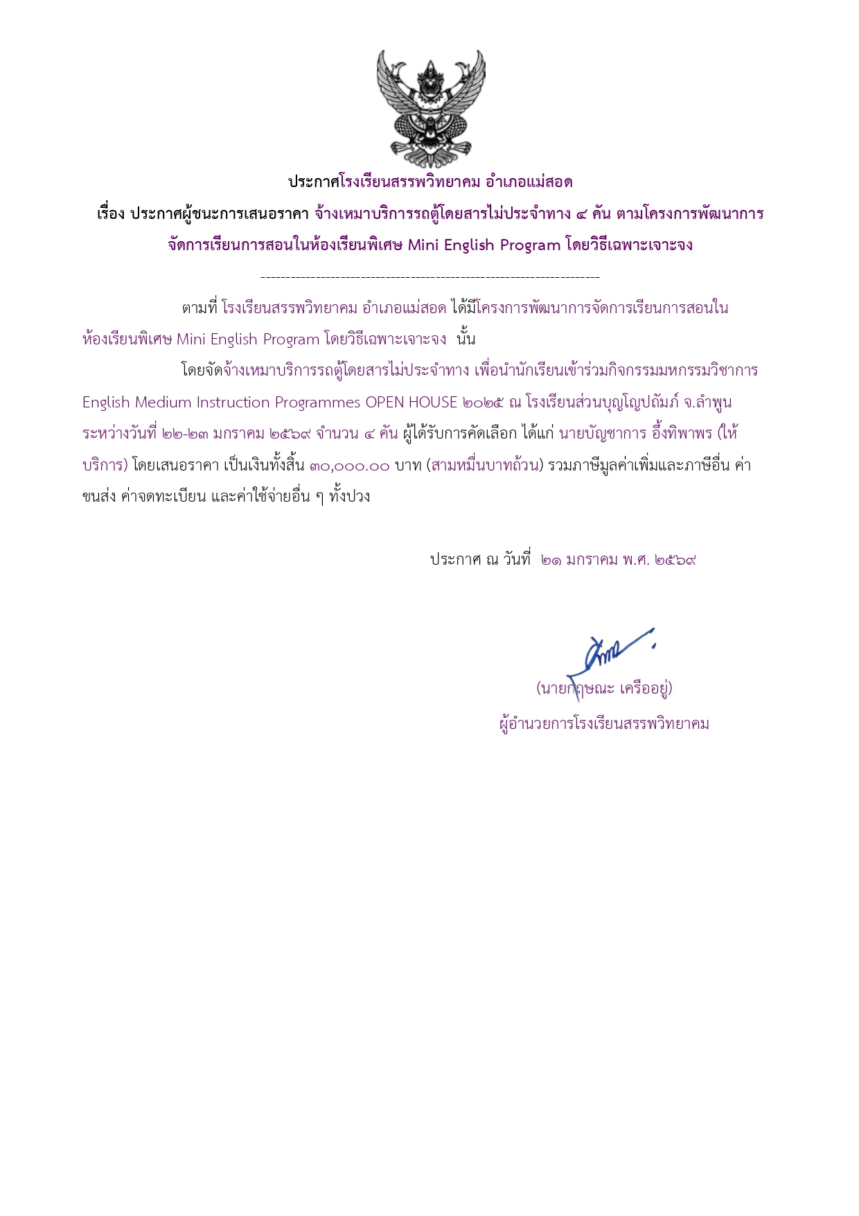 ประกาศผู้ชนะการเสนอราคา จ้างเหมาบริการรถตู้โดยสารไม่ประจำทาง ๔ คัน ตามโครงการพัฒนาการจัดการเรียนการสอนในห้องเรียนพิเศษ Mini English Program โดยวิธีเฉพาะเจาะจง