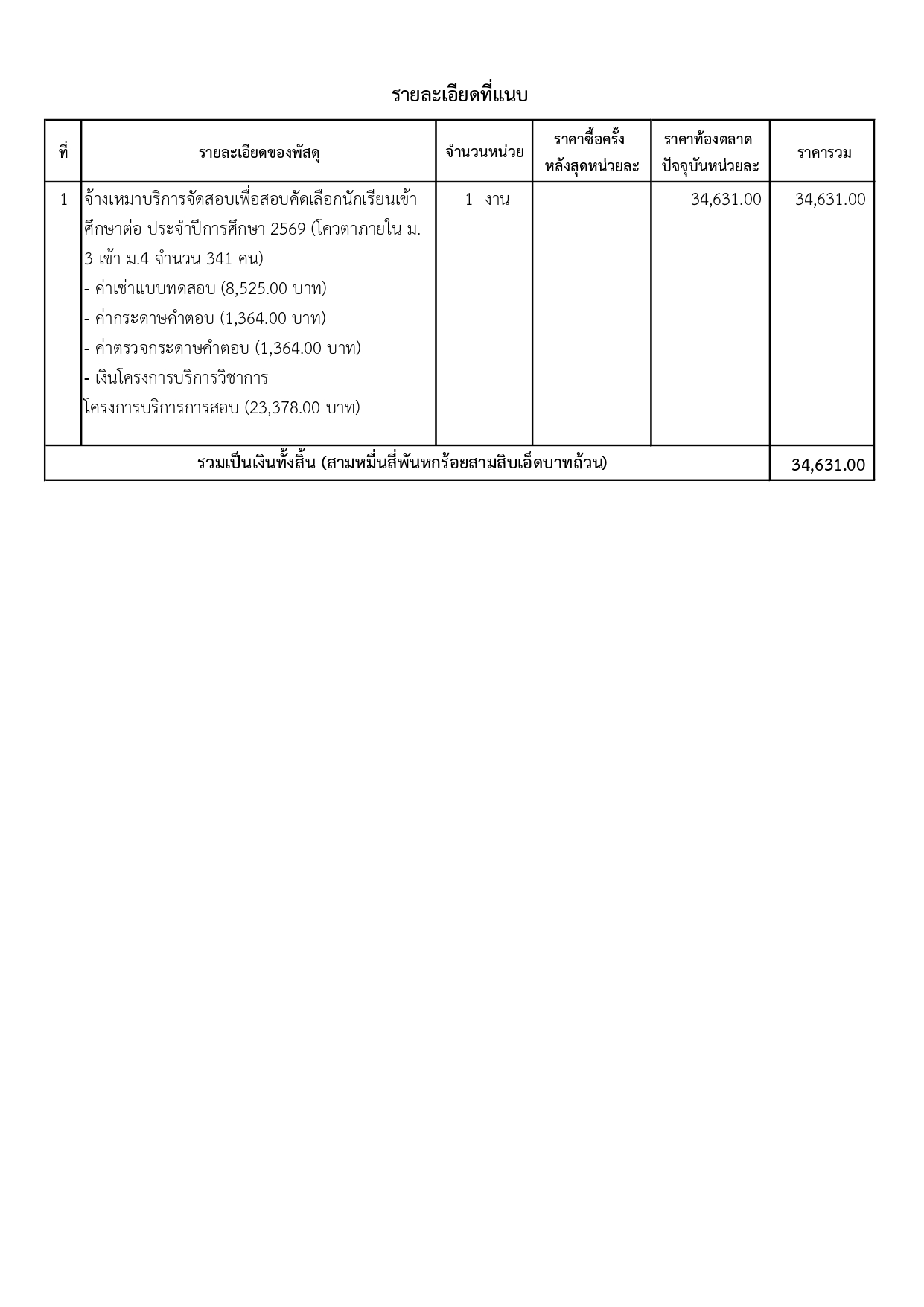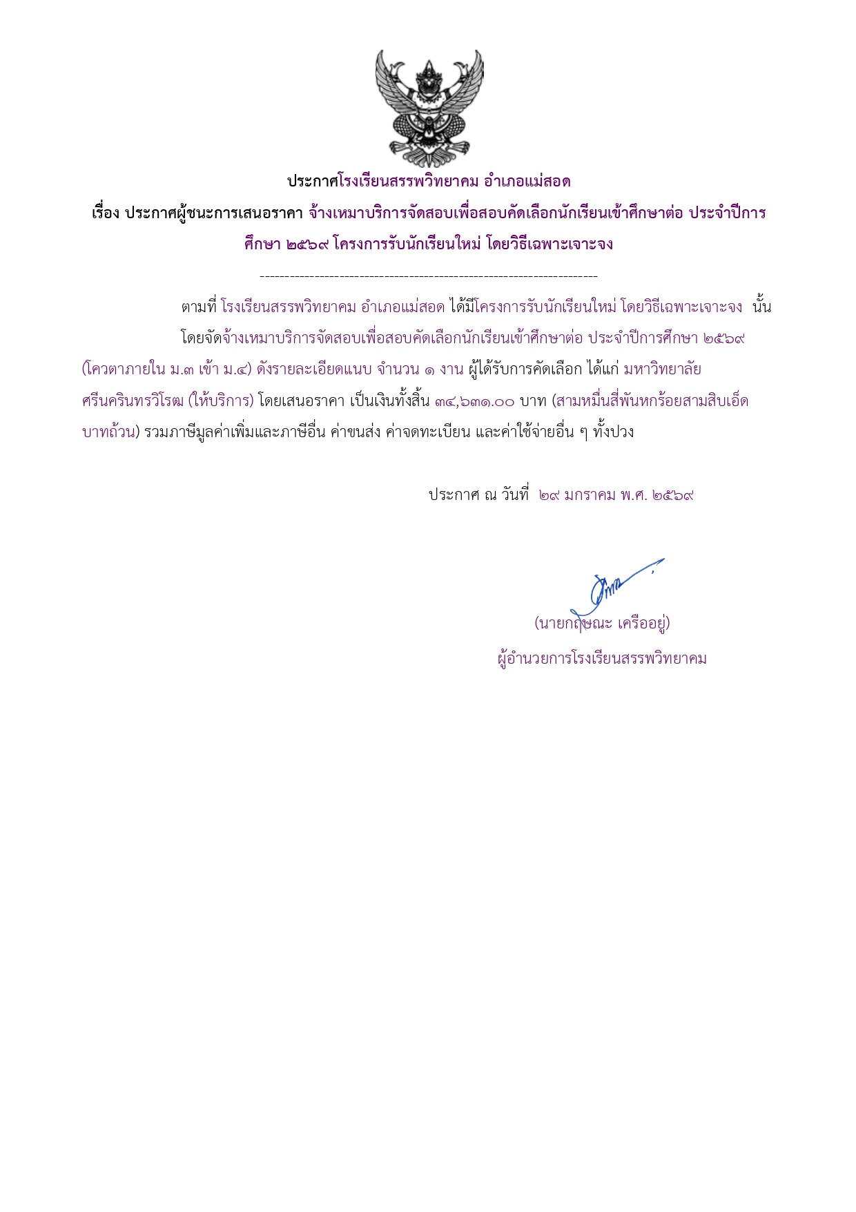 ประกาศผู้ชนะการเสนอราคา จ้างเหมาบริการจัดสอบเพื่อสอบคัดเลือกนักเรียนเข้าศึกษาต่อ ประจำปีการศึกษา ๒๕๖๙ โครงการรับนักเรียนใหม่ โดยวิธีเฉพาะเจาะจง