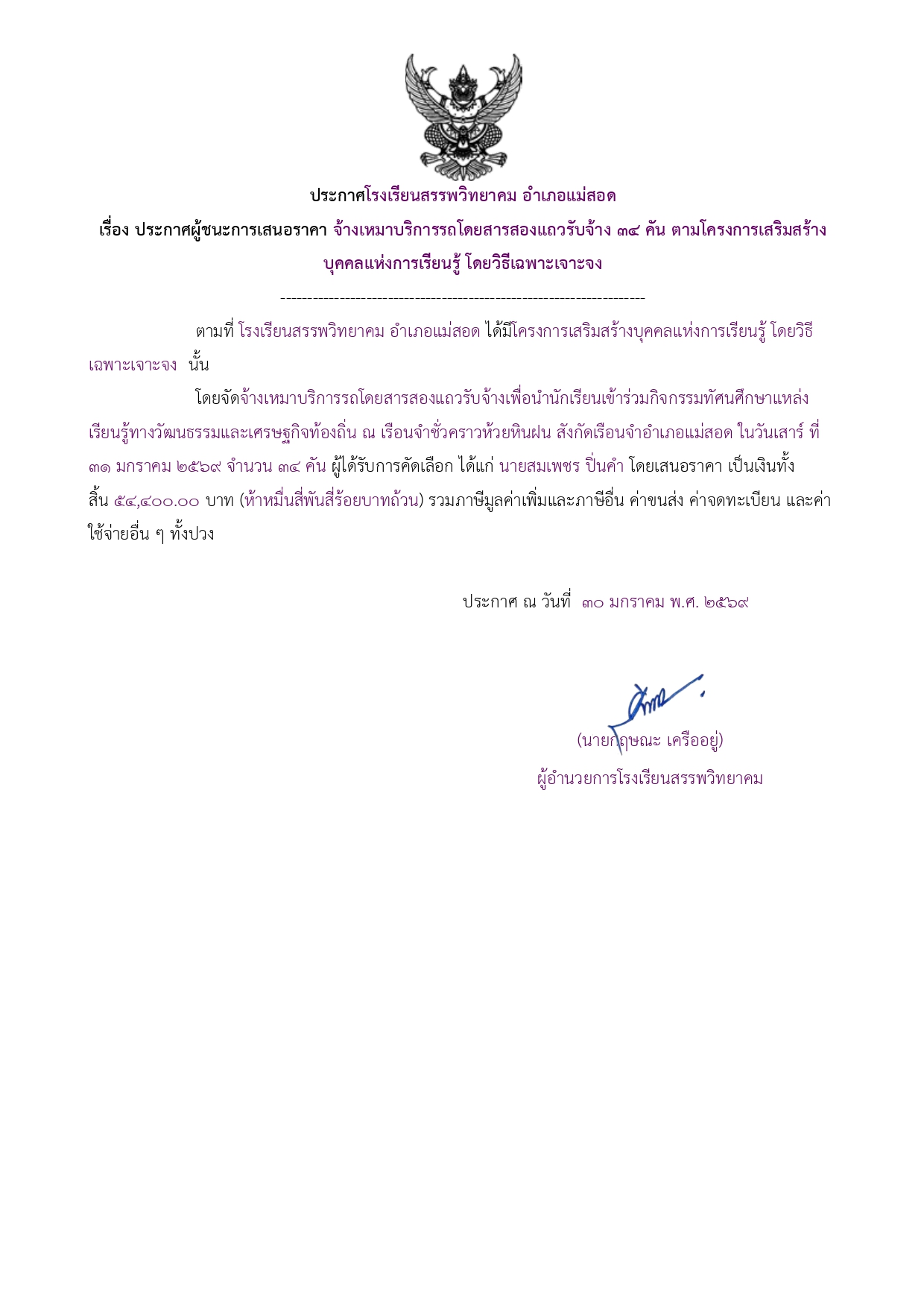 ประกาศผู้ชนะการเสนอราคา จ้างเหมาบริการรถโดยสารสองแถวรับจ้าง ๓๔ คัน ตามโครงการเสริมสร้างบุคคลแห่งการเรียนรู้