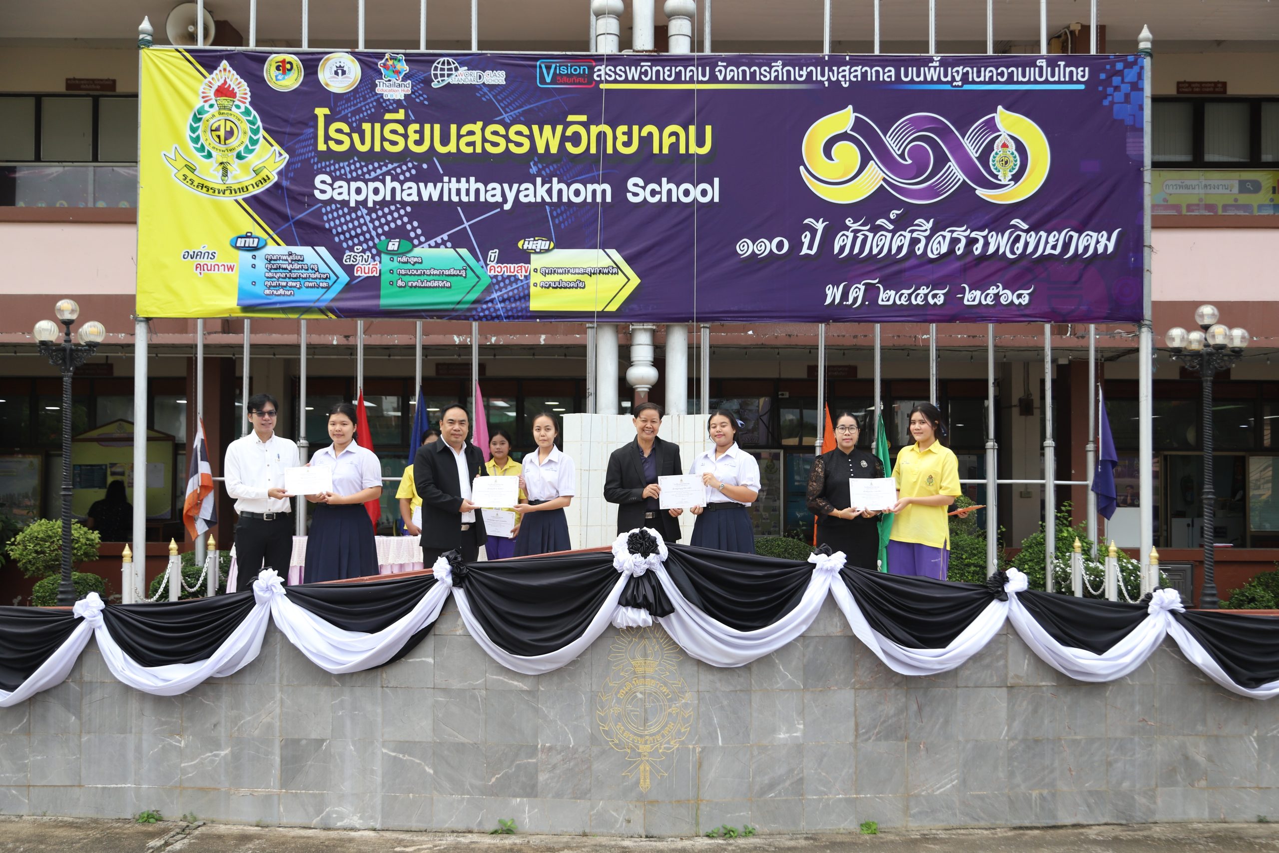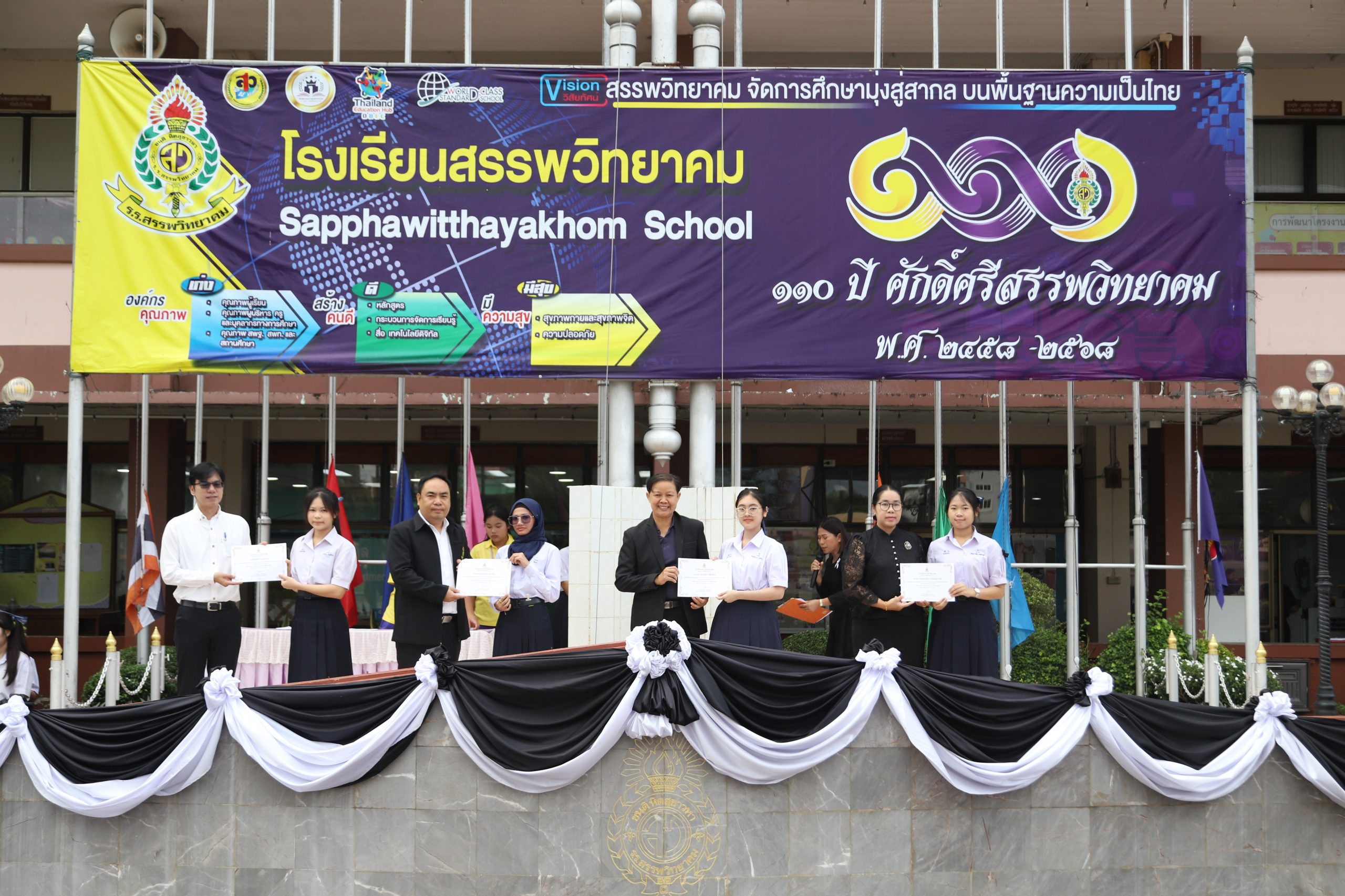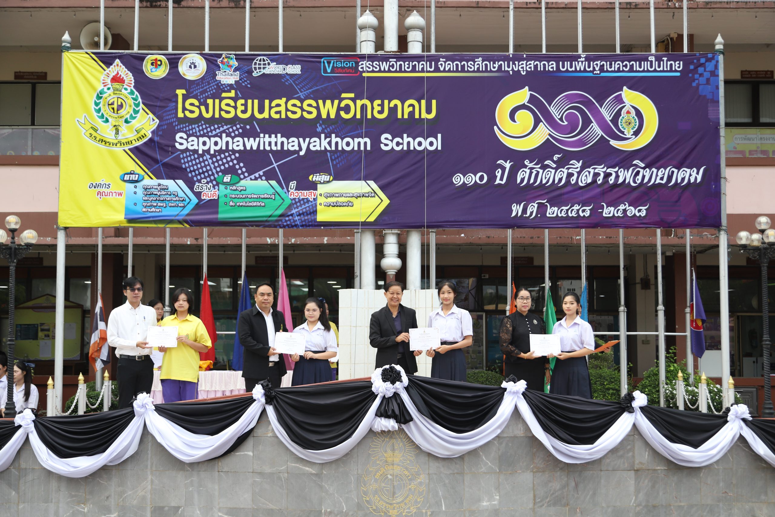 ในการนี้ นายกฤษณะ เครืออยู่ ผู้อำนวยการโรงเรียนสรรพวิทยาคม มอบหมายให้ นางนารินทร์ โทนปั่น รองผู้อำนวยการโรงเรียนสรรพวิทยาคม พร้อมด้วยคณะผู้บริหาร เป็นผู้มอบเกียรติบัตร ณ โรงเรียนสรรพวิทยาคม